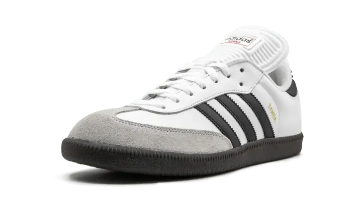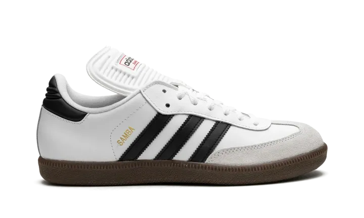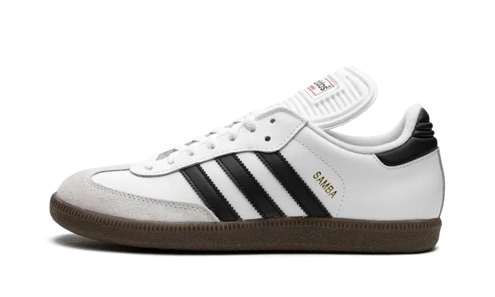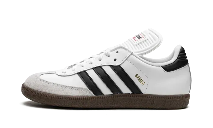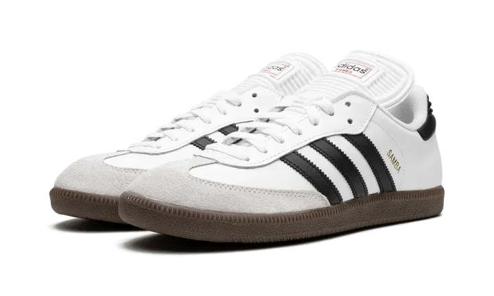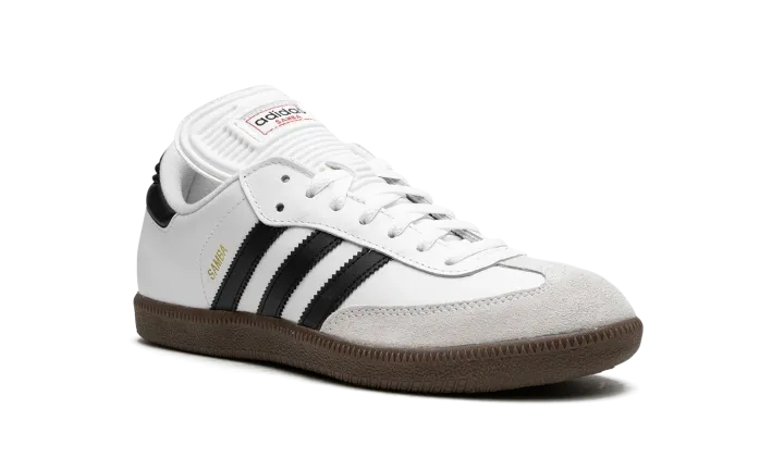The adidas Samba "White/Black" is a classic, original colorway of the retro indoor soccer shoe that doubles as an easy-wearing lifestyle option. The Samba has enjoyed a resurgence in popularity in recent years, with more and more people from all walks of life coming to appreciate the model's timeless looks, comfort, and versatility—especially in this "White/Black" makeup. The upper features a white leather construction with grey suede overlays on the toe and forefoot. Black Three Stripes branding is found on the sides. "Samba" detailing appears in gold foil lettering on the lateral side of the shoe and an "adidas Samba" patch can be found on the tongue. A gum rubber sole completes the look. PLEASE NOTE: Some older production runs of the white Samba Classic feature a dark brown/black rubber outsole color. When ordering, you may receive the darker sole color until stock has been depleted.