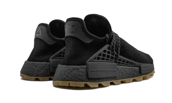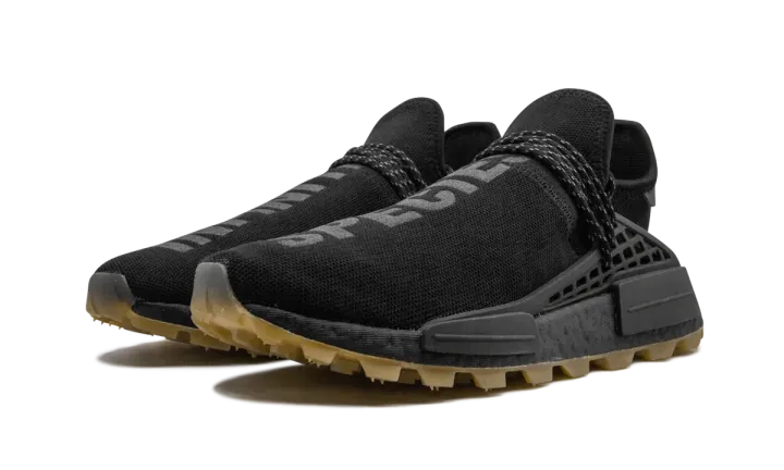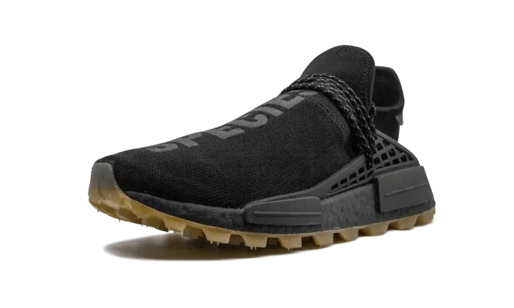 The Pharrell Williams x adidas NMD Human Race Trail "Infinite Species" hit shelves in 2019 as part of a four-pair footwear collection, further spreading the music artist's message of unity and humanity. The upper, laces, and Boost midsole are all colored black and paired with a rugged gum outsole. The lifestyle sneaker promotes the "Infinite" and "Species" motifs with tonal text on the left and right foot, while a rainbow-colored Hu logo and tonally black adidas Trefoil logo hit the left and right heel, respectively.