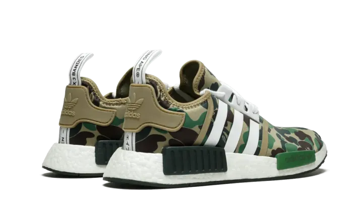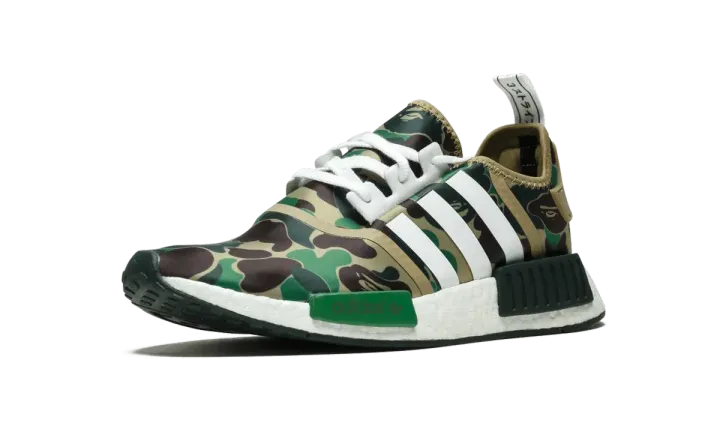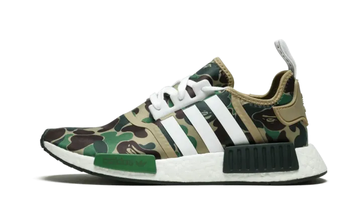 A true case of executing a collab the right way, the A Bathing Ape x adidas NMD_R1 in "Green Camo" incorporates the DNA of both brands. BAPE's patented duck camo is the dominant force on the upper, while Three Stripes and a Boost midsole in white offset. Tan and green accents round out the shoe.