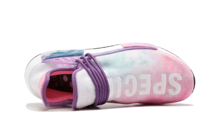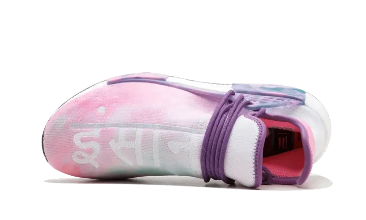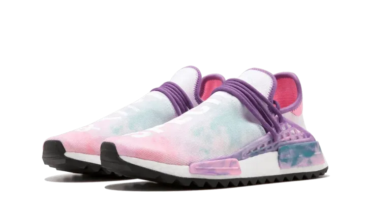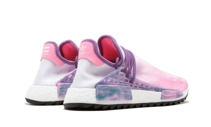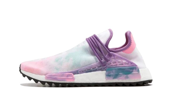 For the Pharrell x adidas NMD Hu Trail "Holi" in Pink Glow, Pharrell Williams journeyed to India for inspiration. Inspired by the Indian Festival of Colors, the NMD Hu Trail replicates what sneakers might look like after a walk through a Holi celebration, which is characterized by splashes of brightly-colored liquid and powder. The tie-dye effect on the Pharrell x adidas NMD Hu Trail "Holi" Pink Glow features a blend of light pink, purple, green, and blue shades across the knit upper and marbled cage and midsole inserts. The unique colorway quickly became one of the most popular Pharrell x adidas NMD Hu Trail colorways to date.