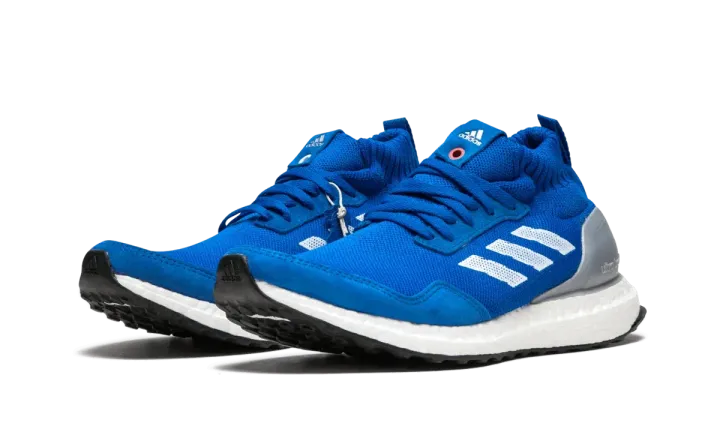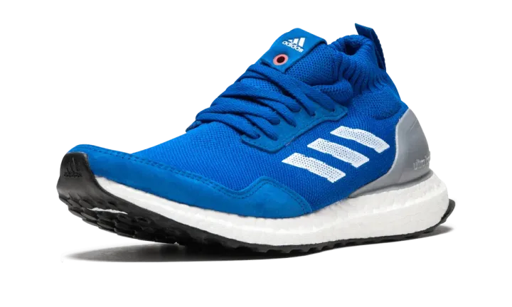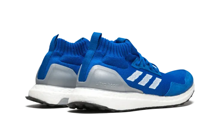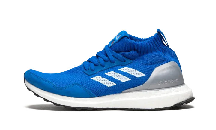 KITH introduced the Ultra Boost Mid to the world. The model returns once again with this 2017 adidas Consortium release titled "Run Thru Time." The sneaker features the traditional Ultra Boost heel cage in a simple matte grey appearance to offset the vibrant blue Primeknit upper. Updated suede lands on the toecap and lacing support for a vintage twist. This version of the Ultra Boost sports a mid-top shape with an ankle collar for support. Three Stripes branding appears in white to match the full-length Boost cushioning. A black outsole brings the design home, rounding out the clean shoe.