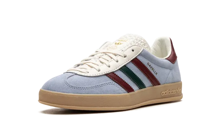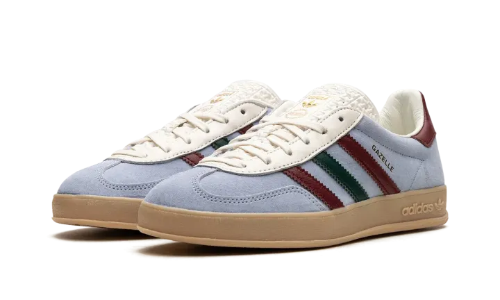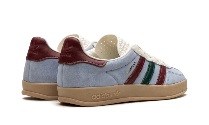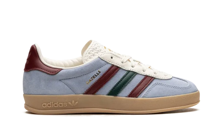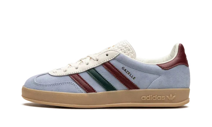 The adidas Gazelle Indoor "Blue Dawn" is a unique colorway of the retro indoor soccer shoe with a casual look. The colorway features a Blue Dawn suede construction with a cream leather eyestay and cream leather tongue. The sneaker's iconic Three Stripes branding is designed in burgundy and green stripes on the sides. Additional burgundy accenting appears on the leather heel tab with debossed "adidas" detailing. A gum rubber sole with an "adidas" logo on the lateral side of the heel completes the look. Release date: August 25, 2023