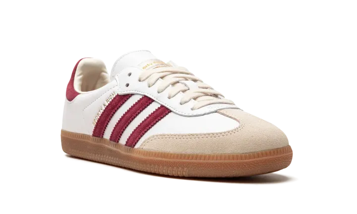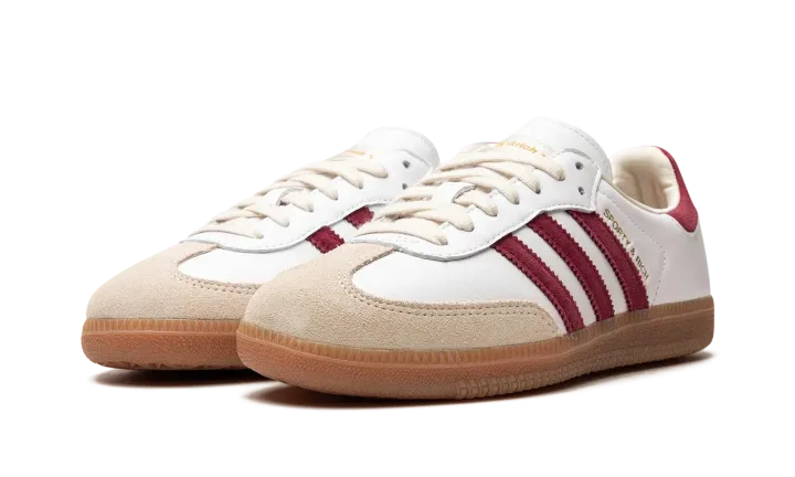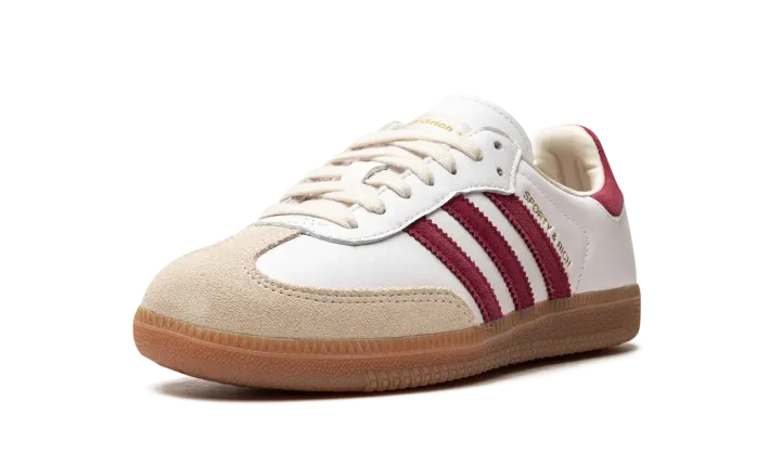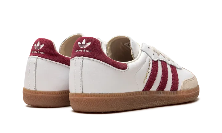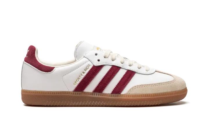 The Sporty & Rich x adidas Samba "Burgundy" is a collaboration by Emily Oberg's sportswear brand on a colorway of the classic sneaker with burgundy details. The adidas Samba "Burgundy" by Sporty & Rich features a white leather base with a tan suede overlay on the toe. A Core Burgundy suede Three Stripes logo appears on the side, as does gold "Sporty and Rich" branding. Dual "adidas" and "Sporty and Rich" detailing is found on the Core Burgundy suede heel tab. Classic adidas Samba branding appears on the tongue. A gum rubber sole completes the look. Release date: November 10, 2023