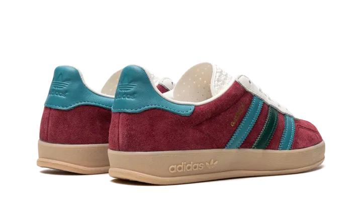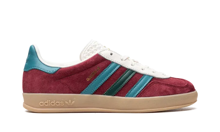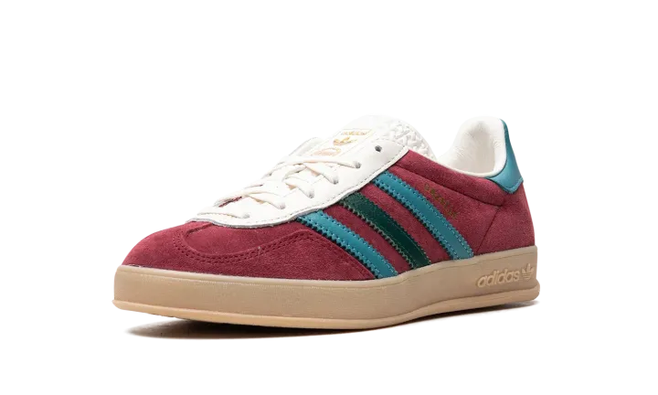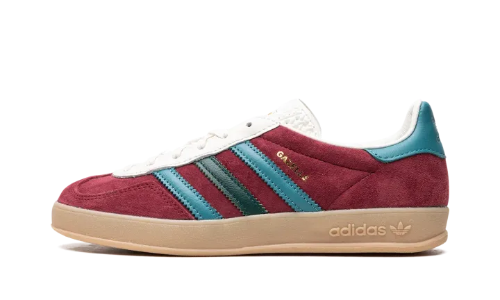 The adidas Gazelle Indoor "Collegiate Burgundy" is the retro indoor soccer shoe with a unique color combination. A decidedly lifestyle-ready design, the colorway features a Collegiate Burgundy suede upper with a cream leather eyestay. The sneaker's iconic Three Stripes branding is designed in teal and green stripes on the sides. More teal accenting lands on the leather heel tab. A gum rubber sole with an "adidas" logo on the lateral side of the heel completes the look. Release date: August 25, 2023