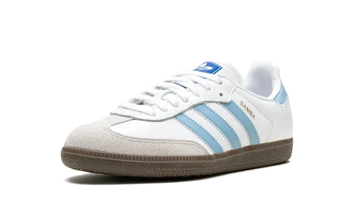 Bring a cheerful, retro pop of color to your wardrobe with the Adidas Samba OG 'White Sky Blue'. This iconic silhouette features a crisp, full-grain leather upper as its pristine white base. "Clear Sky" blue accents adorn the signature serrated Three-Stripes and heel tab, creating a vibrant contrast. Complete with the classic suede T-toe design and a supportive gum rubber cupsole, this shoe blends vintage court heritage with fresh, everyday versatility.