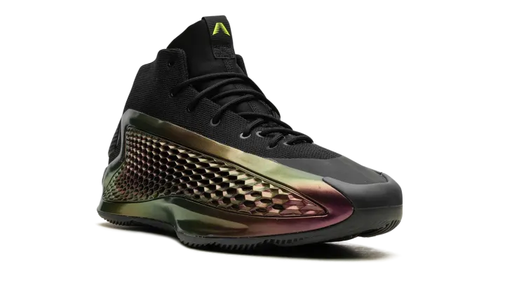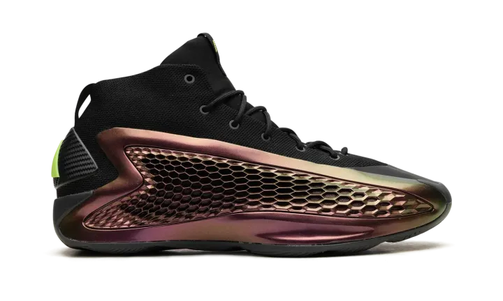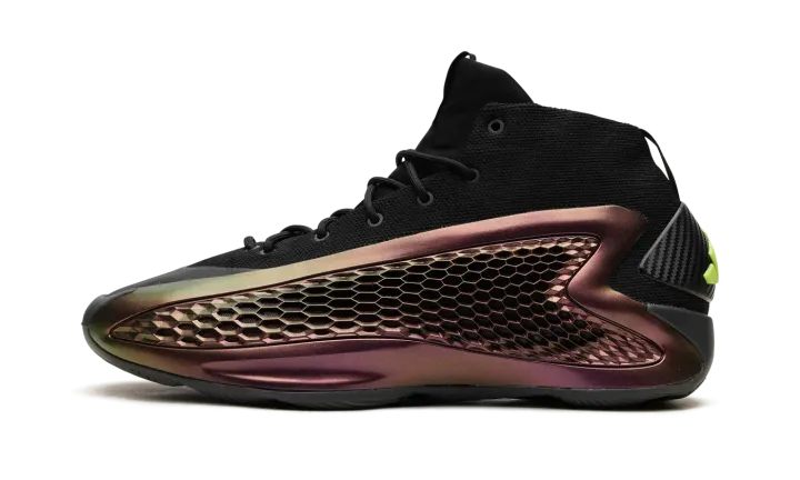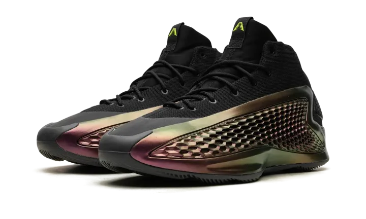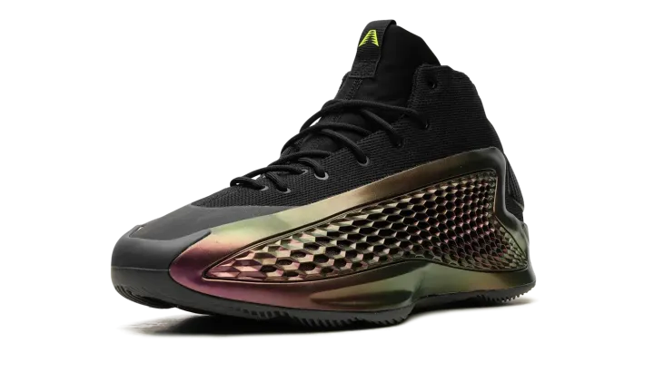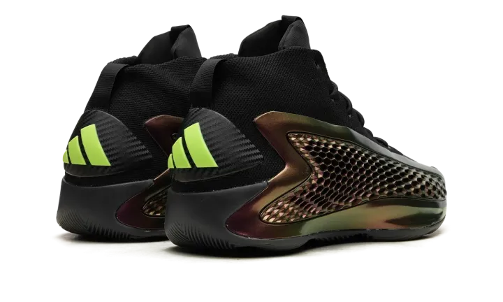 The adidas AE1 "All-Star" is a colorway of Anthony Edwards's first signature shoe with adidas Basketball in a colorway inspired by the 2024 NBA All-Star Game. The adidas AE1 "All-Star" features an iridescent TPU "cage" with perforations in a honeycomb pattern that assist in breathability. The black Primegreen base is made of recycled materials. Edwards' signature branding appears on the woven tongue tag, while adidas Three Stripes branding can be found on the heel. The midsole is designed with a combination of adidas's Boost and Lightstrike cushioning for superior performance and energy return.