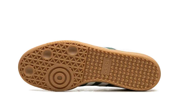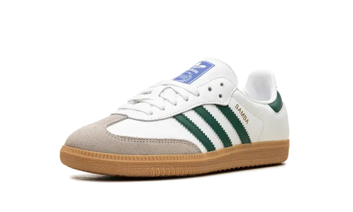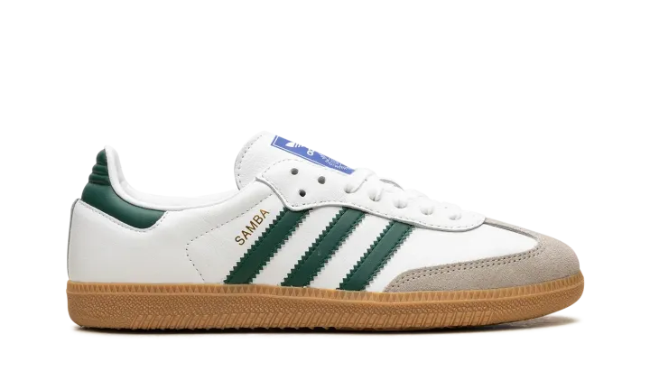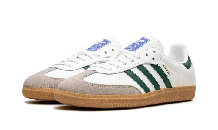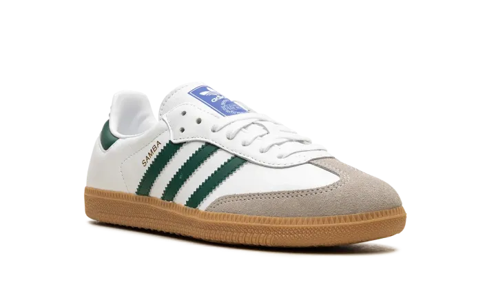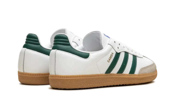 The adidas Samba OG "Collegiate Green" is a colorway of the retro shoe with green accents. The upper features a white leather base contrasted with a grey suede overlay on the toe, and a green leather panel on the heel tab. Collegiate Green leather Three Stripes appear on the sides, while a gold foil "Samba" logo can be seen on the lateral side of the mid-panel. Classic adidas Samba detailing is printed on the tongue. A gum rubber sole completes the look.