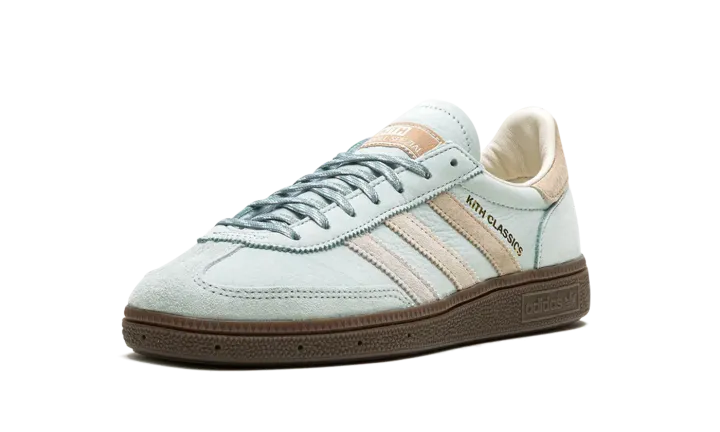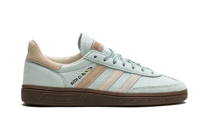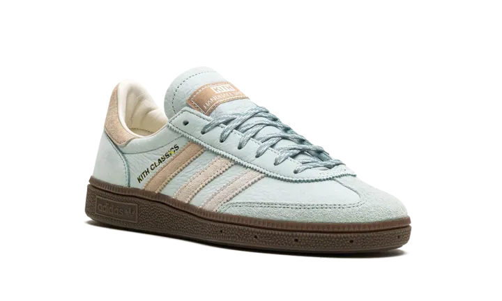 The Kith x adidas Handball Spezial "Classics Program - Amazon Green" is a colorway of the retro shoe by the popular sneaker and streetwear retailer. The adidas Handball Spezial "Classics Program - Amazon Green" by Kith is part of a larger collection of essential footwear styles designed through the lens of the New York based retailer. The upper features an Amazon Green leather design with tan leather Three Stripes branding on the sides. A "Kith Classics" logo appears on the lateral side of the mid-panel, while a tan leather overlay can be found on the heel. Classic "adidas" branding appears on the tongue. A dark gum rubber sole completes the look.