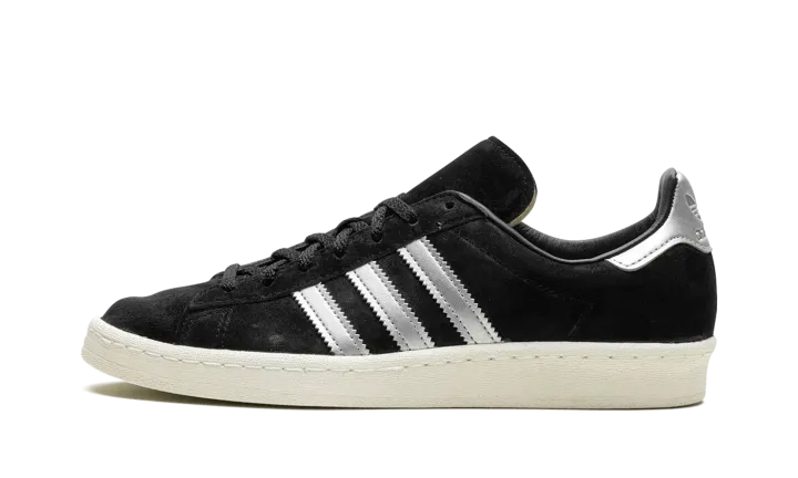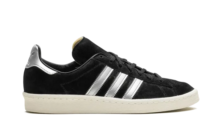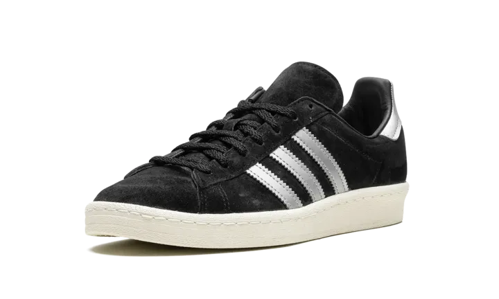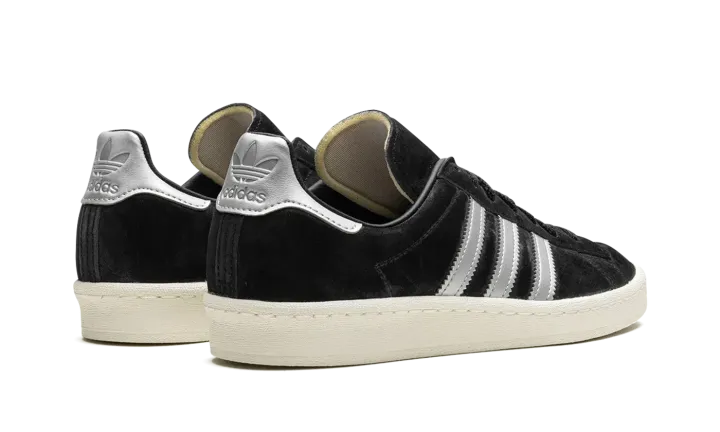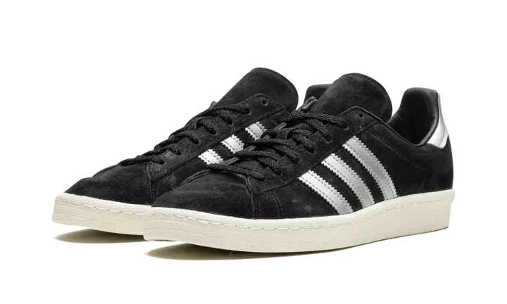 The adidas Campus 80s "Black/Off White" is a two-tone, black-and-white colorway of the retro shoe by the German footwear brand. The adidas Campus 80s in "Black/Off White" is designed in a versatile look for everyday wear. Specifically, the upper has a black suede construction and is contrasted with flashy Metallic Silver leather Three Stripes on the sides. More eye-catching Metallic Silver accenting appears on the heel. A black suede tongue and Off White rubber sole complete the look.
