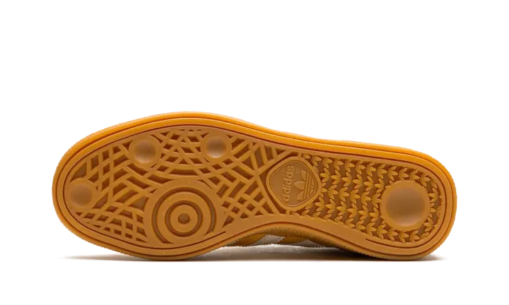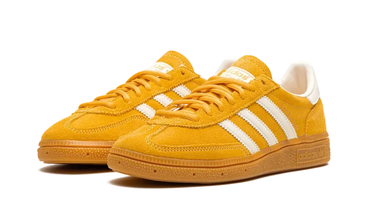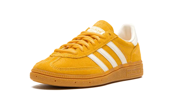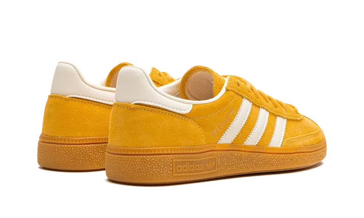 The adidas Handball Spezial "Preloved Yellow" is a yellow-based colorway of the popular casual shoe. The "Preloved Yellow" is complete with w Preloved Yellow suede construction and tonal suede overlays on the toe and eyelets. Cream White leather Three Stripes branding can be found on the sides. Additional Cream White accenting appears on the leather heel tab and "adidas" branding on the tongue. A gum rubber sole completes the look.