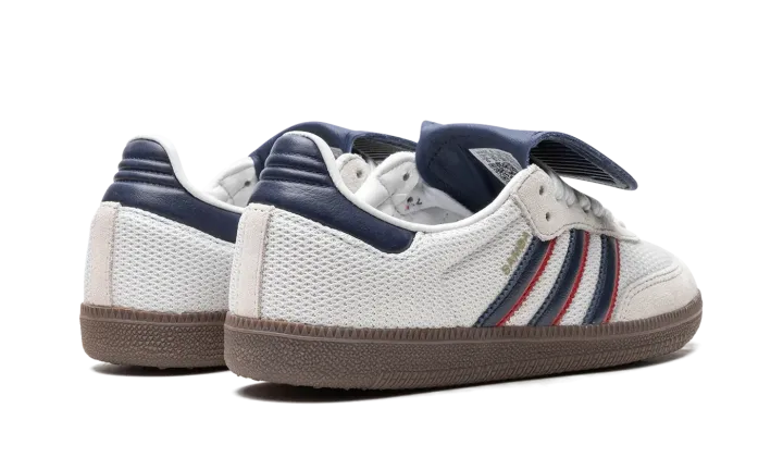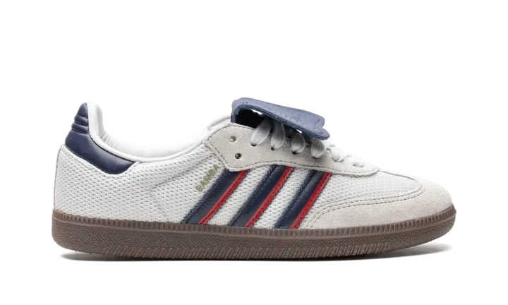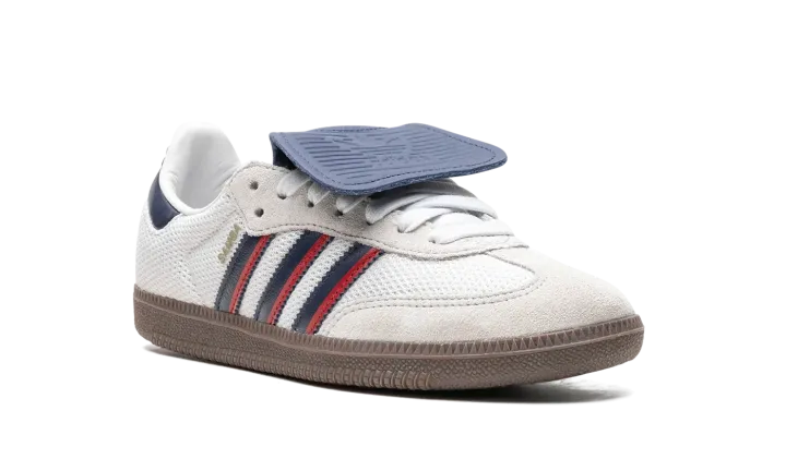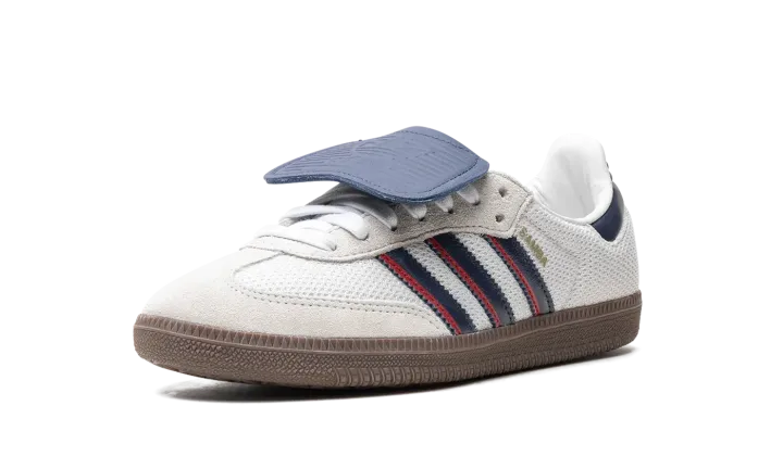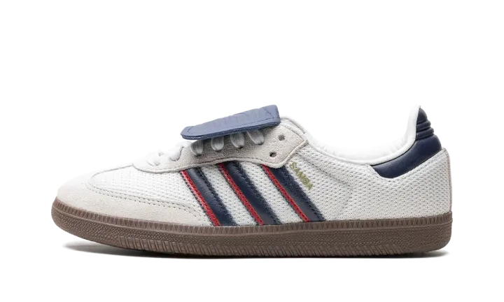 The adidas Samba LT "Crystal White/Dark Blue" is a colorway of the popular sneaker with a mesh construction. The "Crystal White/Dark Blue" features a Crystal White mesh upper and Dark Blue leather Three Stripes branding on the sides. The shoe's mesh design is a departure from the Samba'a original leather build. As for the rest of the shoe, a classic "Samba" logo appears on the lateral side of the midfoot, while Dark Blue leather can be found on the heel. The foldover-style blue tongue nods to the Samba's soccer shoe roots. A dark gum rubber sole completes the look.