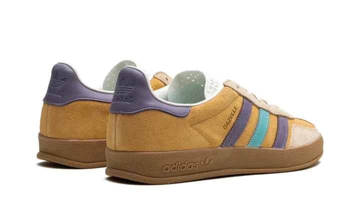 The adidas Gazelle Indoor "Orange/Purple" is a colorway of the retro shoe with a throwback-inspired look. The upper is complete with a washed orange suede construction and a tan suede overlay on the toe. Multicolor Three Stripes branding appears on the sides, while a purple leather overlay can be found on the heel. Gold "adidas" branding appears on the textured white tongue. A gum rubber sole completes the look.