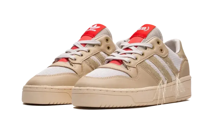 The Extra Butter x adidas Rivalry Low "Battle Royale" is a collaboration between the New York City based sneaker retailer and adidas on the retro shoe from adidas's popular "Consortium Cup" collection. Inspired specifically by Japanese cult classic film "Battle Royale" released in 2000, the colorway at hand has various references to the movie on its design. The shoe features Antique White mesh on the toe and Antique White dotted leather on the mid-panel and heel. A mixture of Khaki-colored leather and suede overlays contrasts the look. The broken-stitching and fraying on the Khaki suede Three Stripes branding can be seen on the sides, and symbolizes the film's plot. Dual branding appears on the tongue and lateral heel. Release date: February 23, 2024