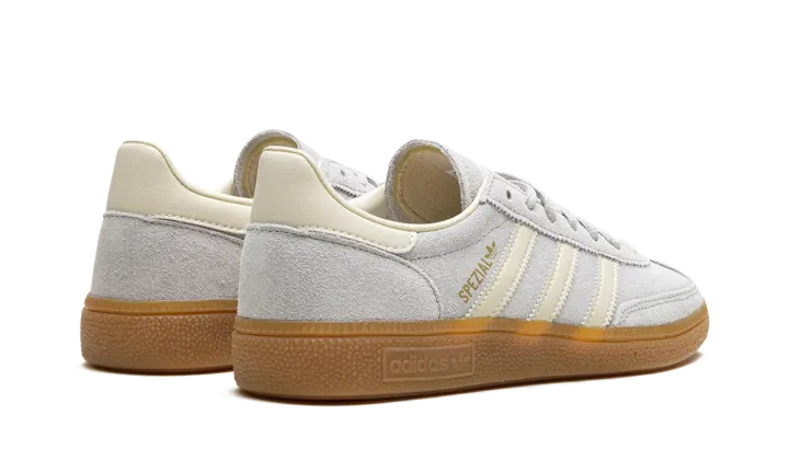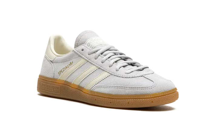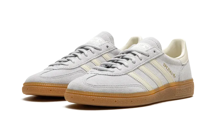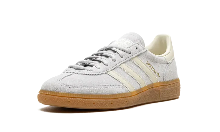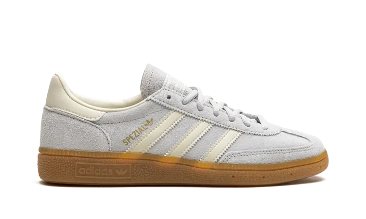 The adidas Handball Spezial "Grey/Cream" is a versatile, grey-based colorway of the casual shoe by the German footwear brand. The upper has a Grey suede construction with Cream leather Three Stripes branding on either side for a classic look. More Cream leather accenting can be found on the heel and inner lining. An "adidas" logo appears on the Grey suede tongue. Underfoot, a Gum rubber sole completes the look.