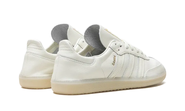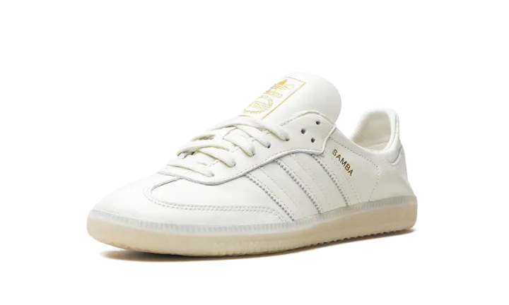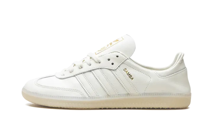 The adidas Samba Decon "Ivory" is a versatile, monochromatic white colorway of the modified version of the classic shoe. The adidas Samba Decon is a stripped-back version of the popular footwear style that has a more streamlined silhouette. On the "Ivory" colorway, the shoe features an Ivory leather upper with tonal leather Three Stripes branding on the sides. A gold "Samba" logo appears on the lateral side of the profile, while gold "adidas" branding is seen on the thin leather tongue. A semi-translucent cream-colored rubber sole completes the look.
