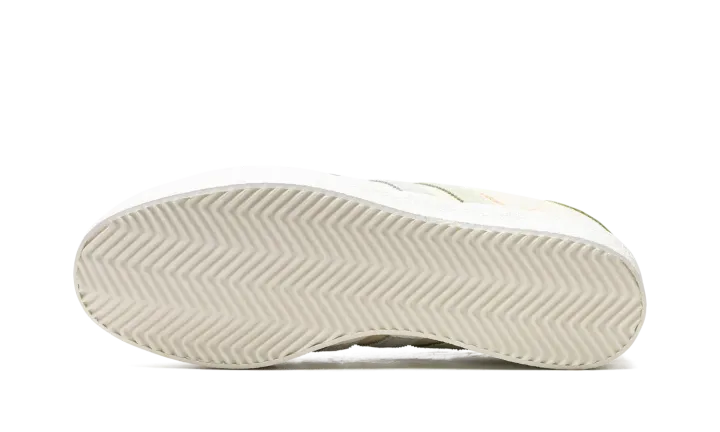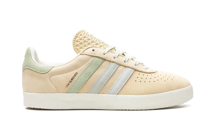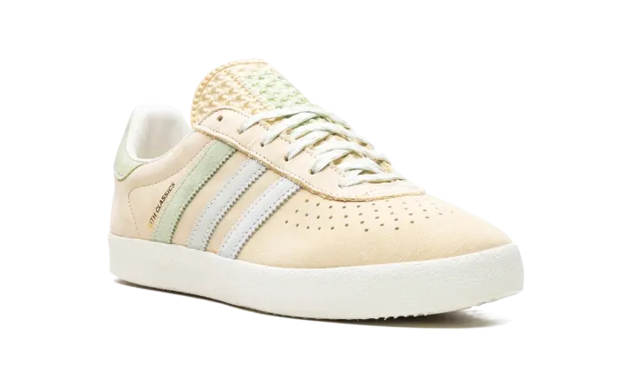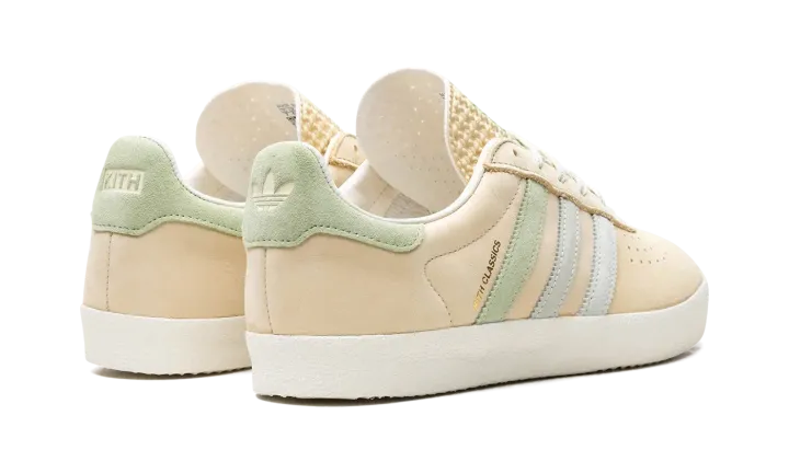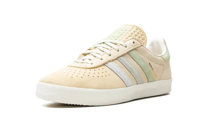 The Kith x adidas AS350 "Classics Program - Arctic Fusion" is a collaboration between Ronnie Fieg's sneaker boutique and adidas on the classic shoe. The adidas AS350 is a retro that was originally made strictly for the Japanese market in the late 1970s and early 1980s. The model returned via collaborations with Kith in 2024. The "Arctic Fusion" colorway has a Pale Yellow leather construction with gradient blue and green suede Three Stripes on the sides. A gold "Kith Classics" logo is stamped on the lateral side of the shoe, and "Kith" and "adidas" logos appear on the left and right heel tab, respectively. A white vulcanized rubber sole completes the look.