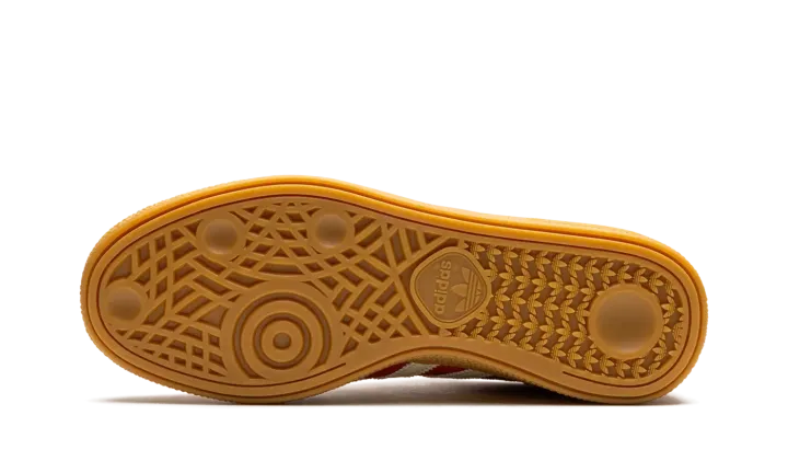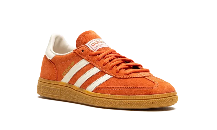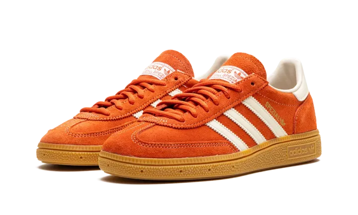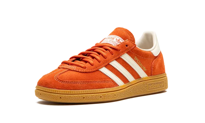 The adidas Handball Spezial "Preloved Red/Cream White" is a colorway of the retro shoe by the German footwear company with a fiery red appearance. The adidas Handball Spezial is inspired by 1980s-era soccer shoes, and is one of adidas's most popular footwear models today. Here, the upper has a Preloved Red suede construction with tonal suede overlays. Contrasting Cream White leather Three Stripes and gold "Spezial" branding appear on the side. Additional Cream White leather accenting can be found on the heel tab, while an "adidas Handball Spezial" graphic appears on the tongue. A gum rubber sole gives the shoe a classic look.