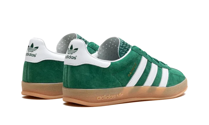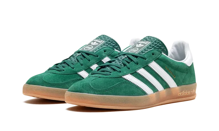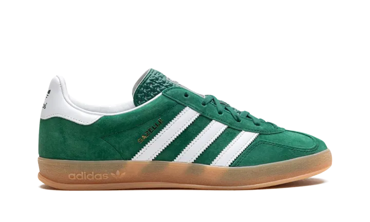 The adidas Gazelle Indoor "Collegiate Green/Gum" is a colorway of the classic indoor soccer and lifestyle shoe designed in green suede. The shoe is complete with a Collegiate Green suede upper and white leather Three Stripes branding on either side. A gold "Gazelle" logo can be found on the lateral side of the mid-panel, while an adidas Trefoil logo appears on the white leather heel tab. More classic adidas branding is located on the tongue. A gum rubber sole completes the clean design with a vintage sportswear aesthetic. Release date: April 1, 2022