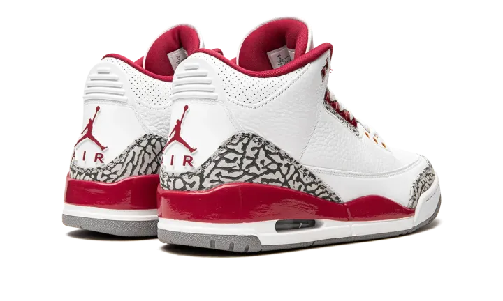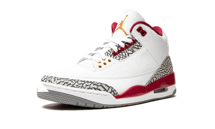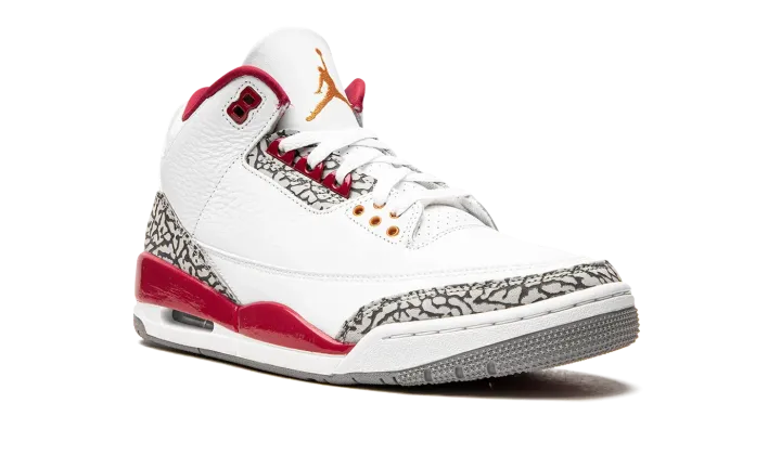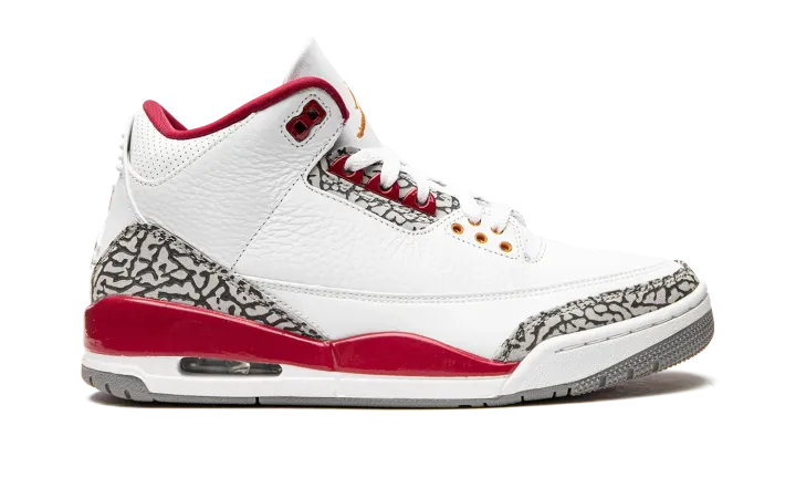 The Air Jordan 3 "Cardinal" is a February 2022 release of the vintage basketball shoe in a colorway inspired by an original Air Jordan 7 colorway. The "Cardinal" Jordan 3 references the colors and materials of the Jordan 7's original "Cardinal" colorway from 1992. The white tumbled leather upper is contrasted with Cardinal Red accenting on the painted mudguard on the heel, collar, and top eyelet holes. Both the bottom eyelets and Jumpman logo embroidered on the white tumbled leather tongue are designed in a Light Curry shade of yellow. A Cardinal Red Jumpman resides on the back of the shoe. The Jordan 3's signature elephant print is found on the toe and heel. Release date: February 19, 2022