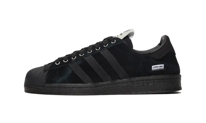 The Superstar 82 'Song For The Mute - Core Black' shoe blends classic Adidas Superstar style with a unique design inspired by the "Song For The Mute" collaboration, featuring a sleek core black aesthetic.