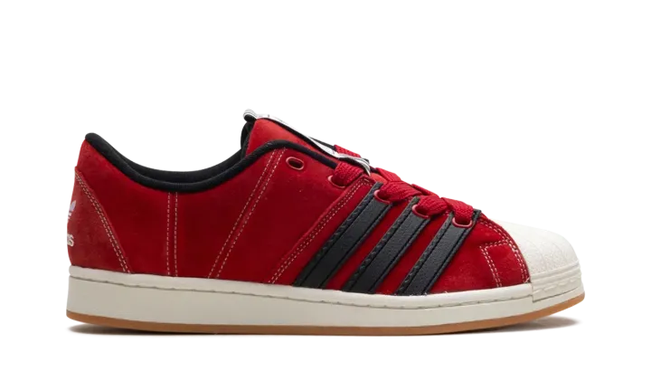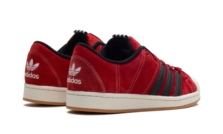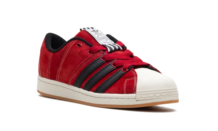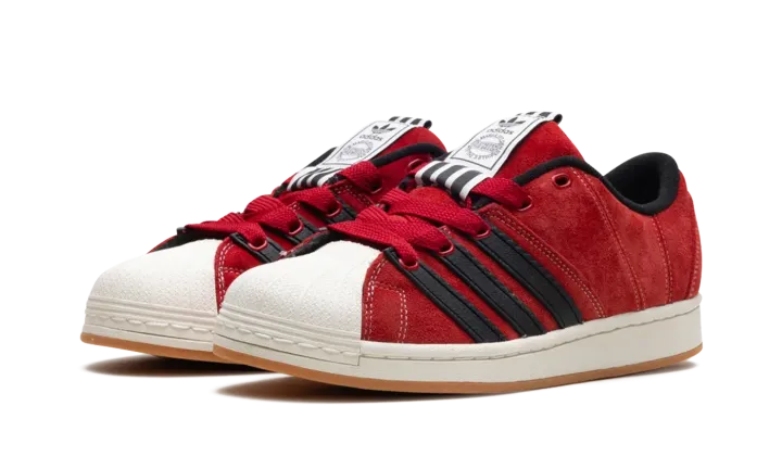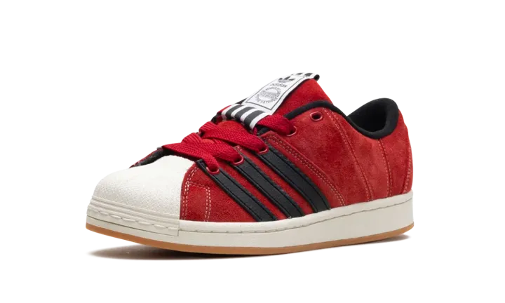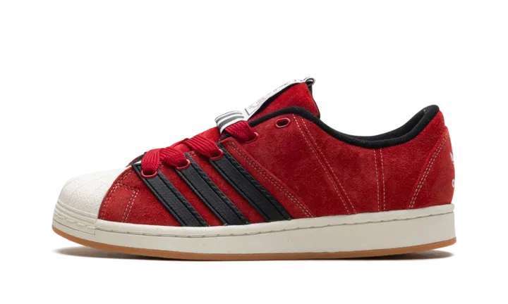 The adidas Supermodified "YNuK - Power Red" is a casual shoe with an early 2000s skate shoe aesthetic. From a Y2K-inspired collection that also features an adidas Adimatic Mid among other silhouettes, the adidas Supermodified "YNuk" in "Power Red" features a red suede construction with black leather Three Stripes on the forefoot. A white leather shell toe cap contrasts the shoe's red design. Graphics by Portuguese artist Crude appear on the insole and packaging. A white rubber midsole with a gum rubber outsole completes the look. Release date: May 24, 2023