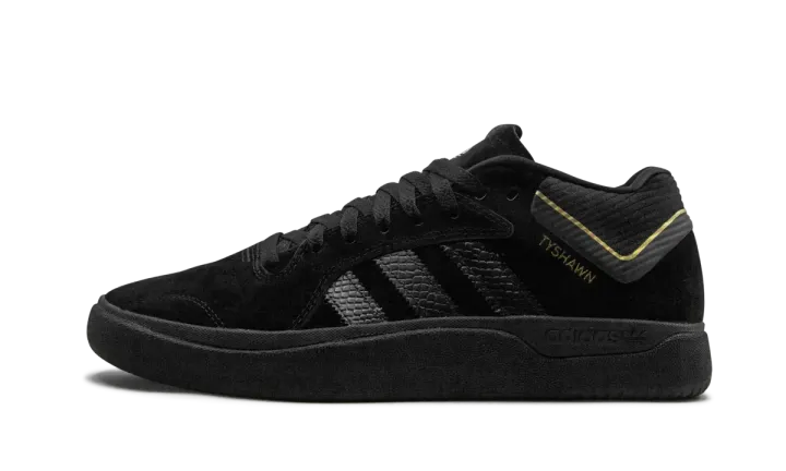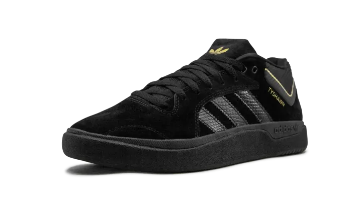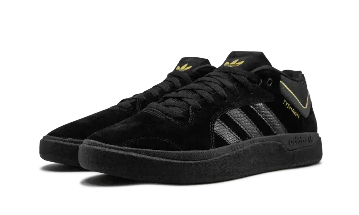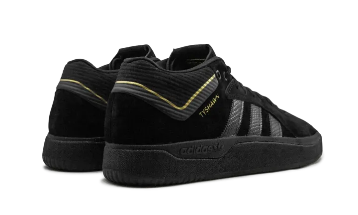 The adidas Tyshawn is a basketball-inspired shoe from one of the greatest skateboarders, Tyshawn Jones. Going for a blacked-out aesthetic, this partnership combines elements of vintage performance basketball models with contemporary skate shoe technology. A black suede base, perforated mid-panel, and heel are joined by a black rubber sole. Black Three Stripes in pebbled leather add texture to the smooth upper, while elegant gold detailing hits the Tyshawn and Trefoil adidas logos, as well as the geometric stripe on the corduroy collar.