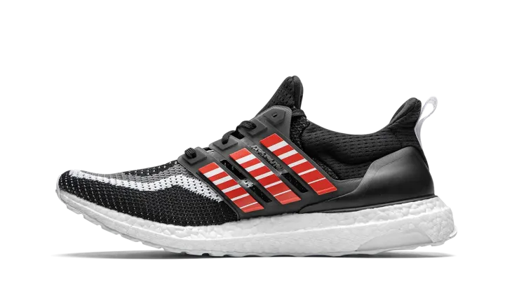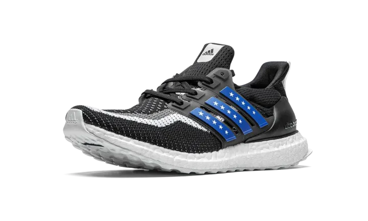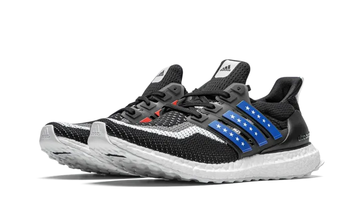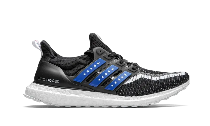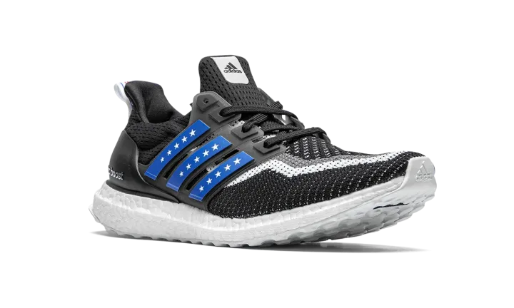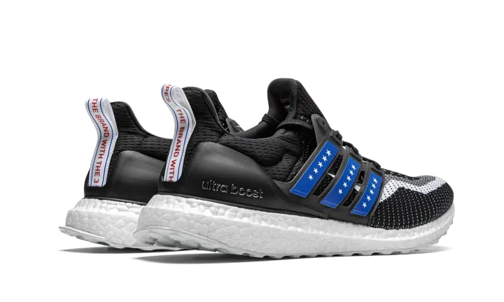 The adidas Ultra Boost 2.0 "City Stars and Stripes" was released as part of a special-edition two-pack in June 2019. Sporting a patriotic theme, this design draws from the American flag. The Primeknit textile upper is made in black and then highlighted by the 2.0's signature gradient pattern with white and grey stripes that wrap around the front of the shoe. The Three Stripes further the flag motif with "Stars" and "Stripes" prints in red and blue, as well as matching insoles. Technical features include a Fitcounter heel, Torsion system, and Boost midsole.