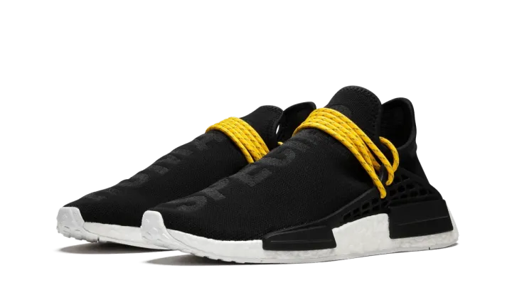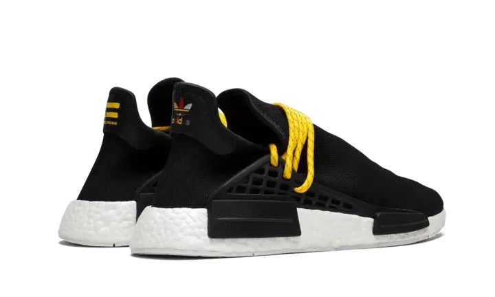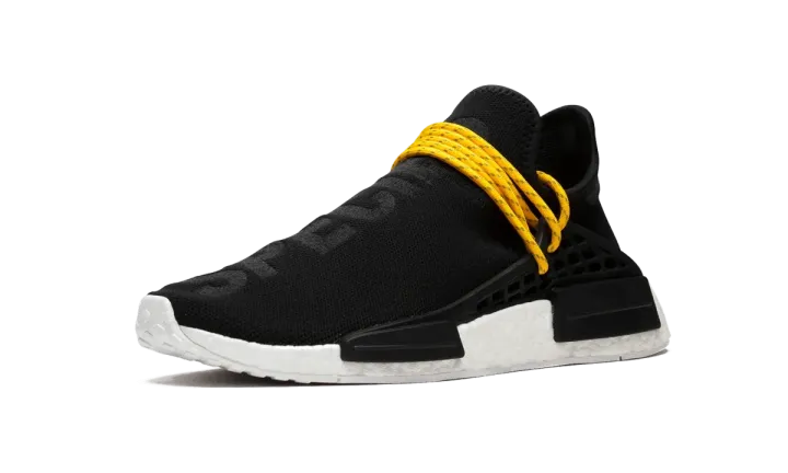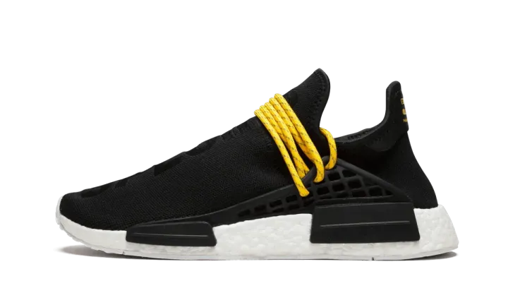 This 2016 version of the Pharrell x adidas NMD Human Race strays from the silhouette's traditional colorful aesthetic in favor of an all-black upper. Even the stitched "Human Species" text across the top of each shoe is blacked out. A bold pop of color comes in the form of bright yellow laces.
