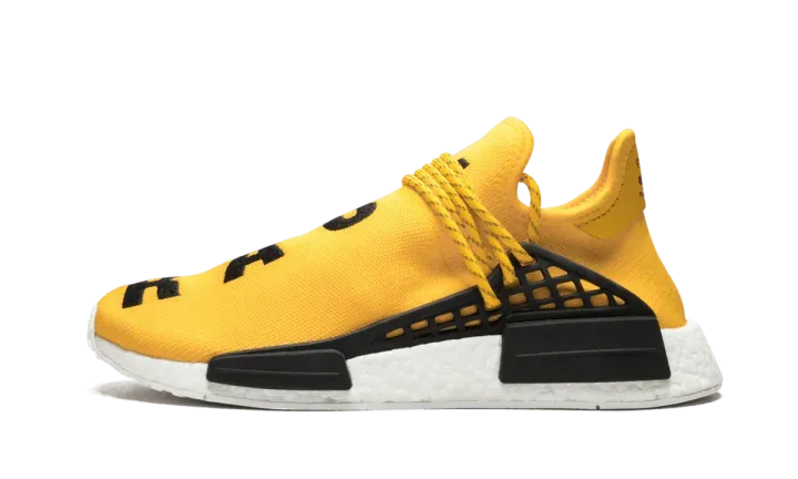 The first release from the incredibly popular series of adidas NMD's by Pharrell, here we have the famous yellow colorway. The modified construction of the NMD by Pharrell features a vibrant yellow mesh upper with black accents, including the "HUMAN RACE" text embroidered down each foot.