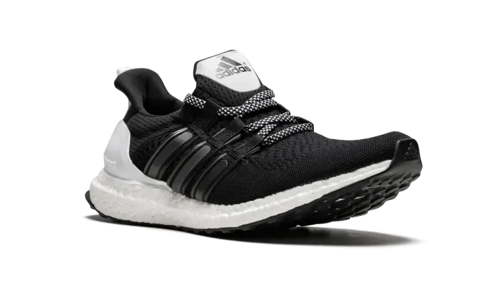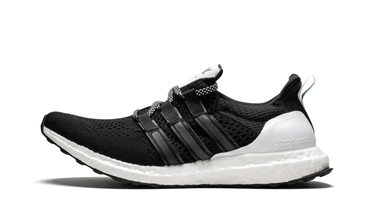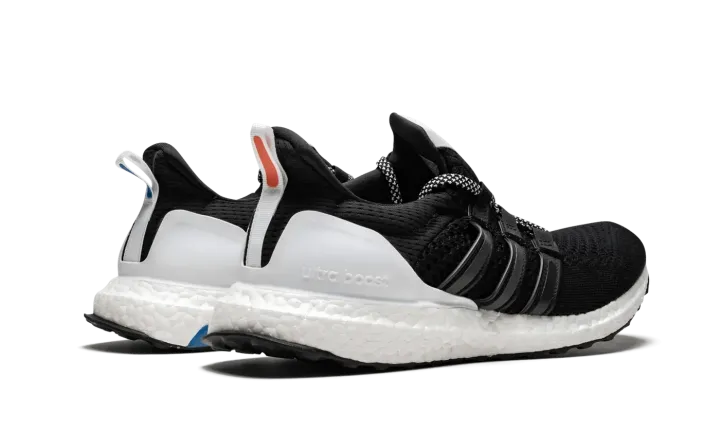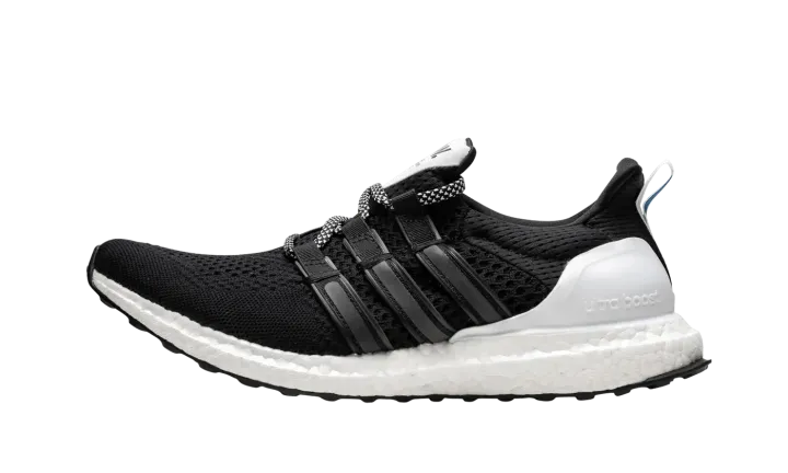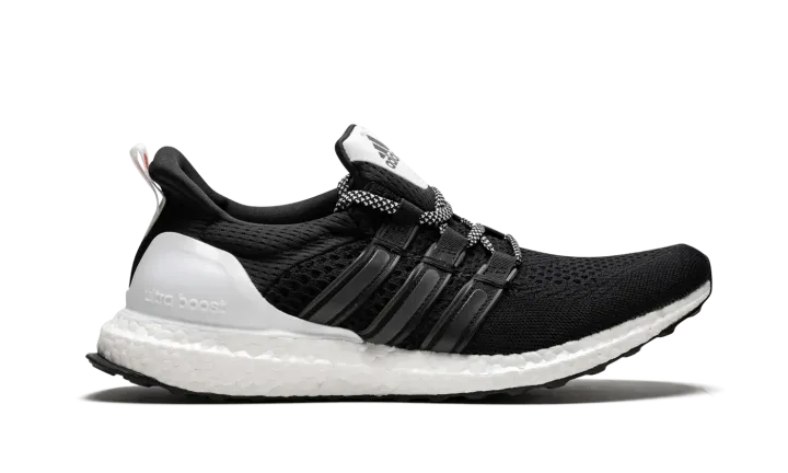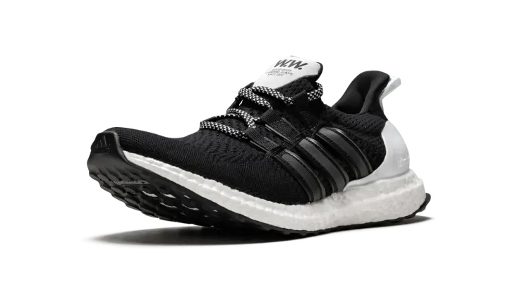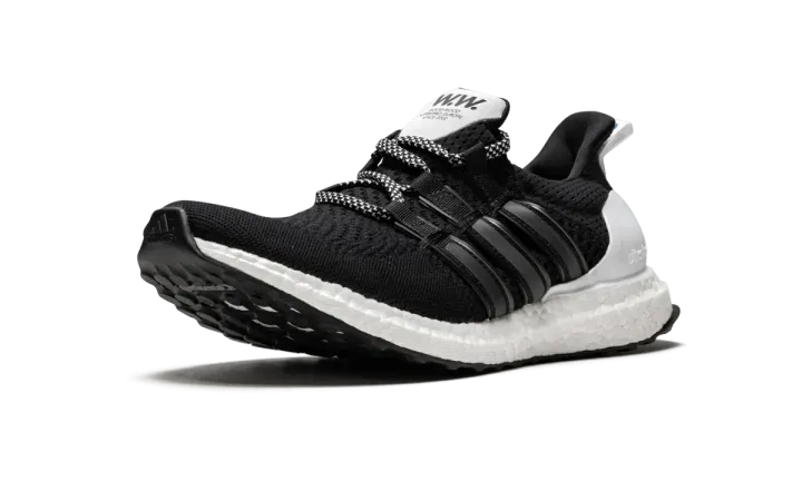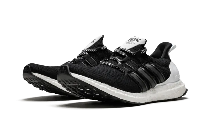 This unique rendition of the adidas Ultra Boost was dreamed up by Wood Wood, featuring modified Three Stripes cages in a black and white colorway. Mismatched red and black accents on opposite feet add another distinct touch.