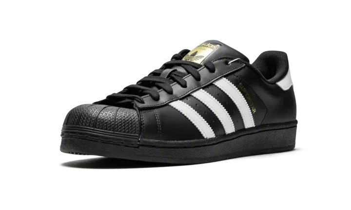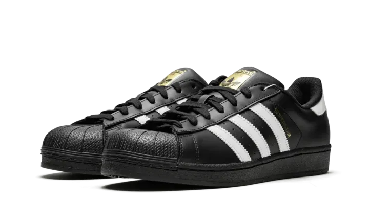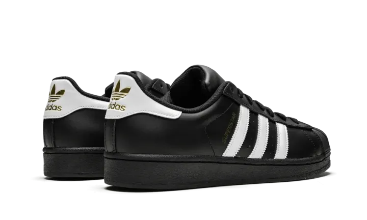 The Superstar Foundation 'Black/White' shoe features a classic two-tone design, offering a versatile and timeless addition to any sneaker collection.