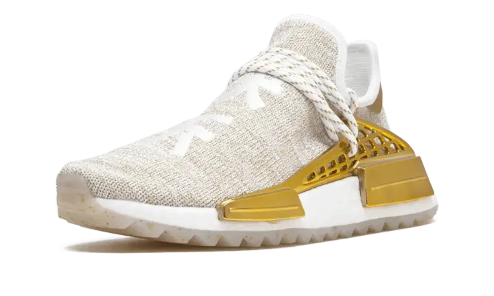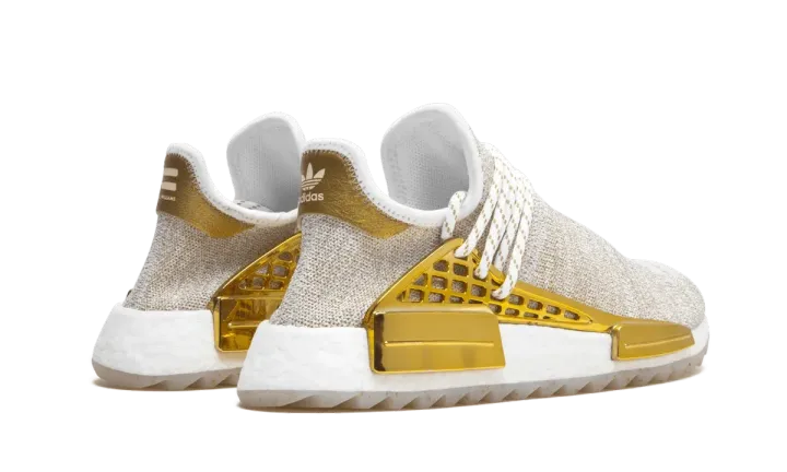 After developing a collection inspired by the Holi festival in India, Pharrell Williams's created a series of adidas NMD Hu Trail sneakers based on the culture of China. Released in 2018, the four-colorway set took inspiration from the concept of yin and yang. Each sneaker symbolizes one of four natural elements. Representing metal, the gold Pharrell x adidas NMD Hu Trail was the headliner of the "China Exclusive" collection. The sneakers blend gold and white colors in the mesh upper and incorporate metallic gold accents in the TPU cage and midsole inserts. The Pharrell x adidas NMD Hu Trail "China Exclusive" was limited to only 300 pairs and given out exclusively to friends and family of adidas Originals.