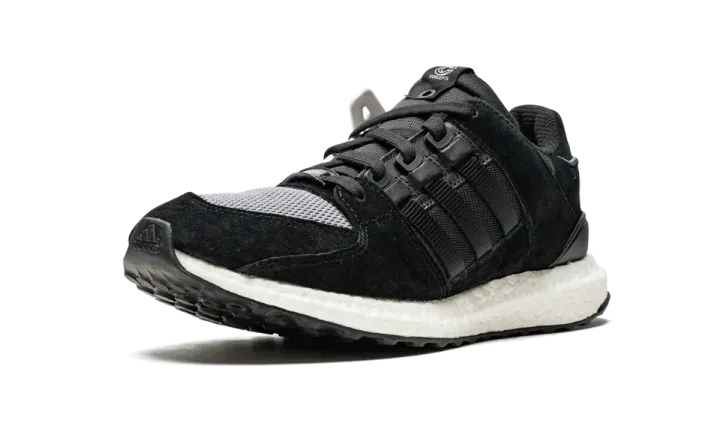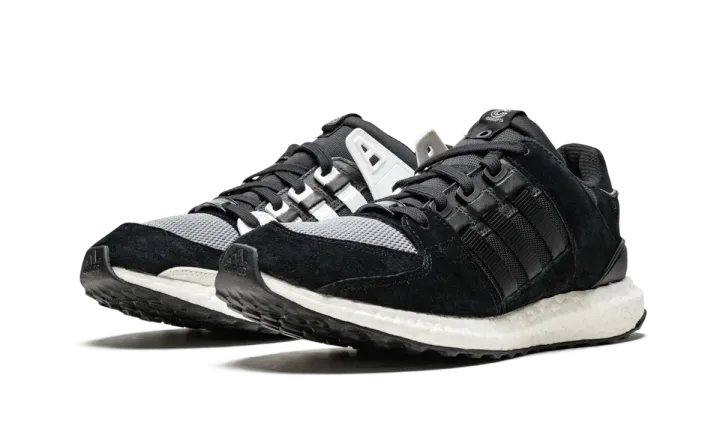 These low top running kicks from Adidas feature an all-black upper on one shoe and a white and black striped pattern on the other. A white pebble-like midsole is shared across both shoes with the Adidas Equipment logo on the back heels.