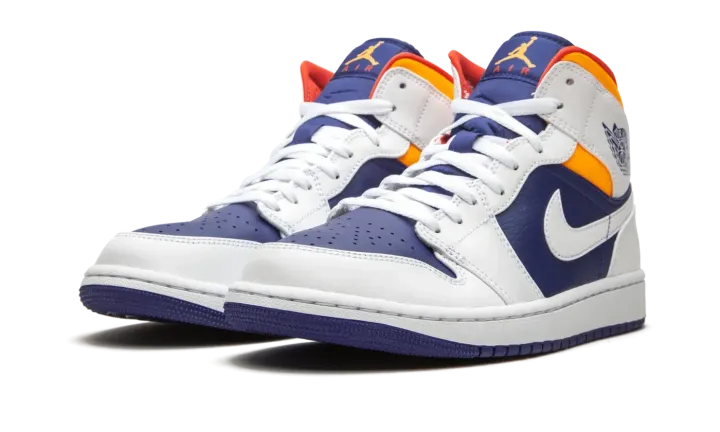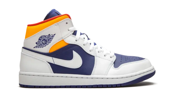 The Air Jordan 1 Mid "Royal Blue/Laser Orange" is an appealing colorway of Michael Jordan's first signature shoe in lowered mid-top height. Dressed in an airy color scheme, this "Royal Blue/Laser Orange" Jordan 1 Mid features stark white leather overlays on the forefoot, eyelets, collar, and heel. Offsetting the look are Royal Blue leather panels that appear on either side and on the perforated toe. Fiery Laser Orange detailing is found on the collar. Branding appears in the form of a white leather Swoosh on the mid-panel and navy "Wings" insignia on the collar. Elsewhere, a navy nylon tongue, burnt orange liner, and orange Jumpman branding on the tonal tongue tab add to the snappy look of this Air Jordan 1 Mid. Release date: Summer 2020.
