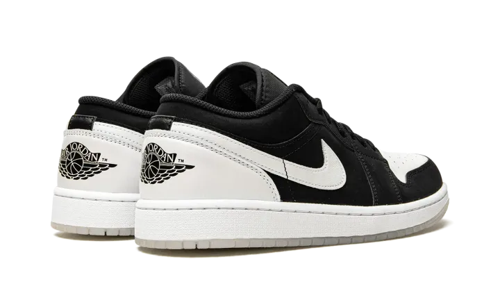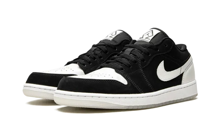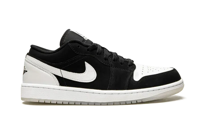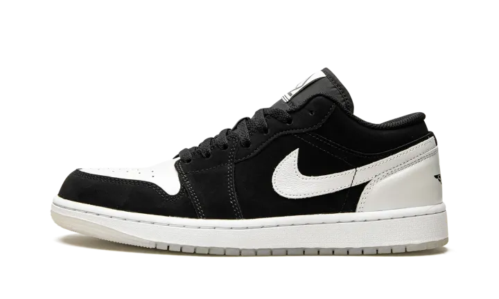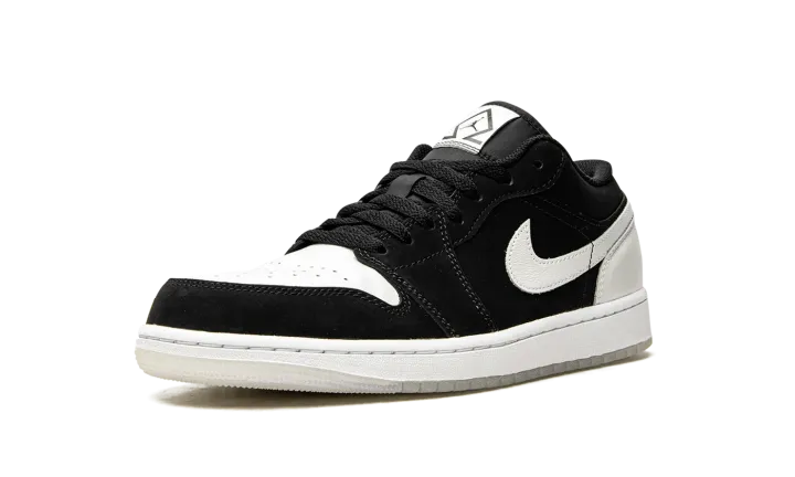 The Air Jordan 1 Low "Diamond" is a February 2022 release of the low-top retro basketball shoe in a colorway inspired by Air Jordan diamond basketball shorts. Versatile in a black-and-white color block, the "Diamond" features black synthetic nubuck on the toe cap, forefoot, eyelets, mid-panel, and collar. The perforated toe, Swoosh, and heel are designed in white leather. A black "Wings" logo is embroidered on the back of the shoe. The unique "diamond" logo found on the tongue tag mimics the design of the same detailing found on the sides of Jordan Brand's mesh basketball shorts, which are inspired by classic Chicago Bulls shorts. A white rubber midsole and milky translucent outsole completes the look.