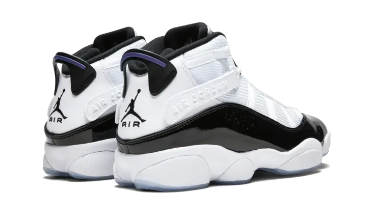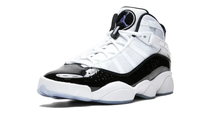 The Air Jordan 6 Rings "Concord" is the 2022 version of the hybrid sneaker in a classic Air Jordan colorway that debuted in 2008. The original Air Jordan 6 Rings "Concord" was released in 2008 before returning in 2021 and 2022. This is the listing for the 2022 version of the shoe that pays homage to the original Air Jordan 11 colorway of the same nickname. The Jordan 6 Rings combines elements of the Air Jordan sneakers worn by Michael Jordan during his six NBA championship victories. The shoe features a white leather construction with a black patent leather mudguard that is inspired by the Jordan 11. Mesh overlays appear in white along the eyelets, another nod to the Jordan 11. A tonal cross-strap is located on the collar, and is a salute to the Air Jordan 8's design. Jordan 8-inspired Jumpman branding is found on the tongue. A black "spoiler" appears on the heel alá the Air Jordan 6. Release date: July 4, 2022