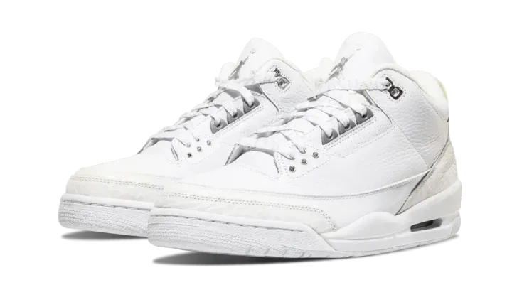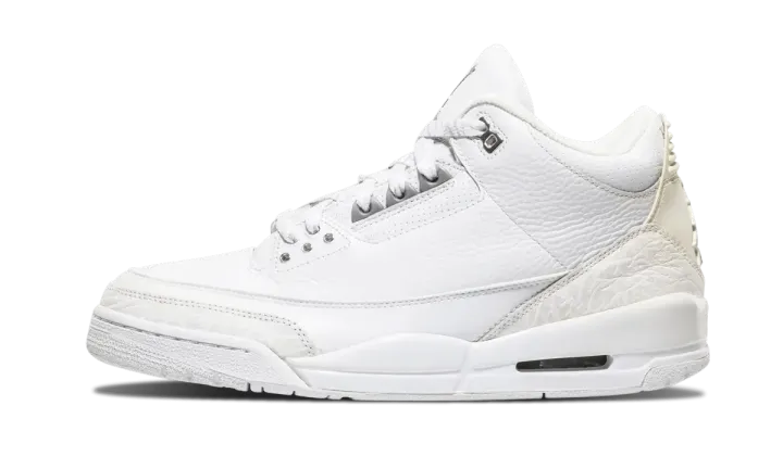 This "Pure Money" colorway of the Air Jordan 3 from 2007 features the silhouette's most pristine look ever in all-white leather with metallic silver accents.