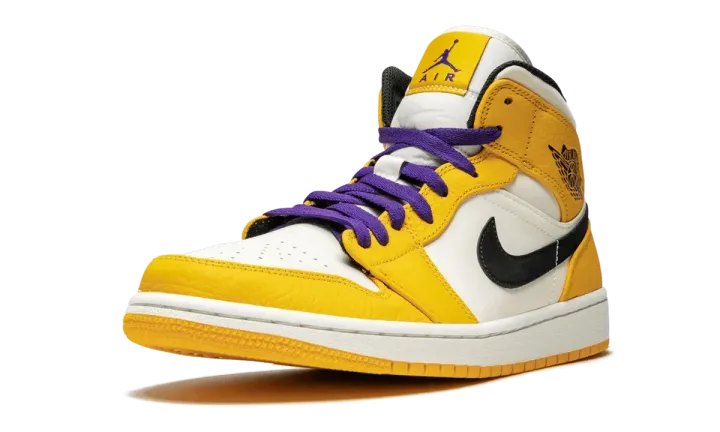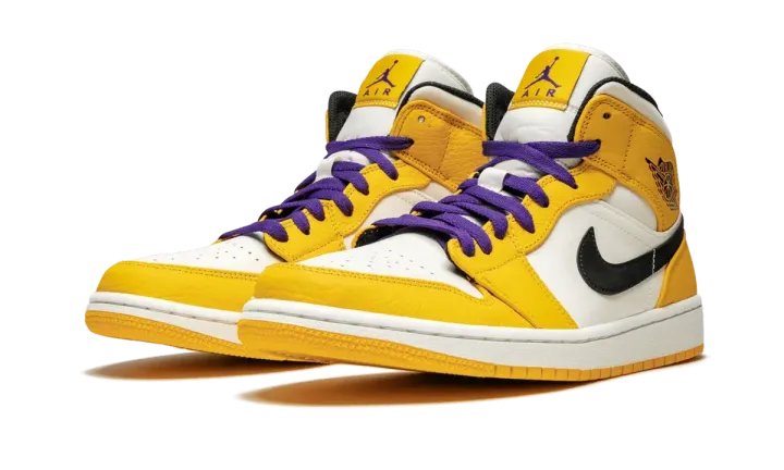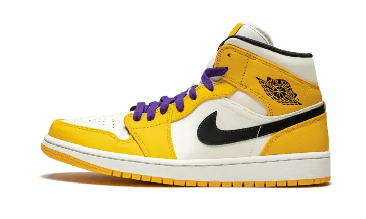 The Air Jordan 1 Mid "Lakers" is a special edition of the mid-top Jordan 1 inspired by the Los Angeles Lakers. The Jordan 1 Mid is outfitted in the team colors of the team Michael Jordan and the Chicago Bulls defeated in the 1991 NBA Finals. The Air Jordan 1 features a white leather base with University Gold full-grain leather overlays and a black Swoosh and inner lining. Purple laces are added to complete the Lakers look. The Air Jordan 1 Mid "Lakers" released in early 2019.