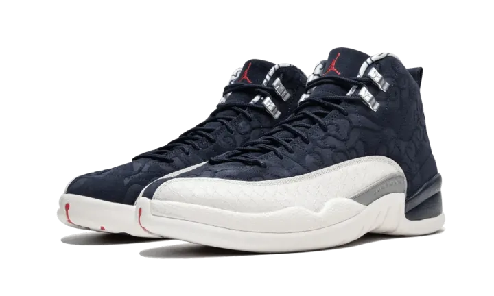 The Air Jordan 12 "International Flight" celebrates Michael Jordan's place as basketball's greatest global ambassador. The special colorway released along with "International Flight" editions of the Air Jordan 3 and Air Jordan 5 in 2018. The specific inspiration for the Air Jordan 12 "International Flight" comes from Japan, where Jordan hosted a basketball clinic in Tokyo in 1996 with other NBA stars. For the event, he wore the original Air Jordan 12. Now the silhouette is transformed into this premium version, featuring a navy suede upper embossed with a graphic inspired by Japanese kimonos. The signature toe panels of the model are featured in a faux white snakeskin material to complete the striking look.