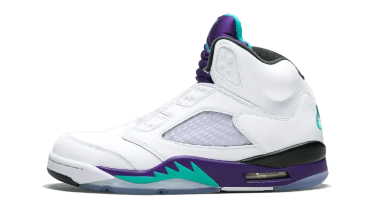 The Air Jordan 5 "Fresh Prince" is a special edition of the iconic "Grape" colorway that was created to celebrate Will Smith's 50th birthday in 2018. Smith's character on the beloved television show "The Fresh Prince of Bel-Air" famously wore the Air Jordan 5 in early episodes without shoelaces. As a reference to that style, these Jordan 5s are designed to be worn without shoelaces and are constructed without lace eyelets. Other "Fresh Prince" details include "West Philadelphia" embossed onto each tongue, OG Nike Air branding on each heel, and graphic insoles that have "Air Jordan" printed on them in a Fresh Prince-style graffiti font. The Air Jordan 5 "Fresh Prince" released in limited quantities in September 2018.
