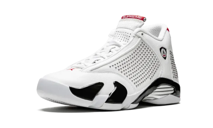 The Supreme x Air Jordan 14 "White/University Red" is one half of the summer 2019 collaboration from the streetwear giant and Jordan Brand. For their first team-up with Jordan since the Air Jordan 5 collection in 2015, Supreme gave a unique new look to the Jordan 14. Their design adds round metal studs across the upper of the sleek silhouette. This colorway features a similar look to the original white and red colorway of the model, built in white leather with red, black, and silver accents. Supreme branding is added to the side Jumpman logos, as well as the heel and tongue. The Supreme x Air Jordan 14 "White/University Red" released in limited quantities on June 13, 2019.
