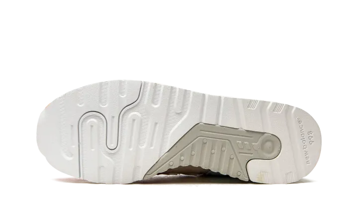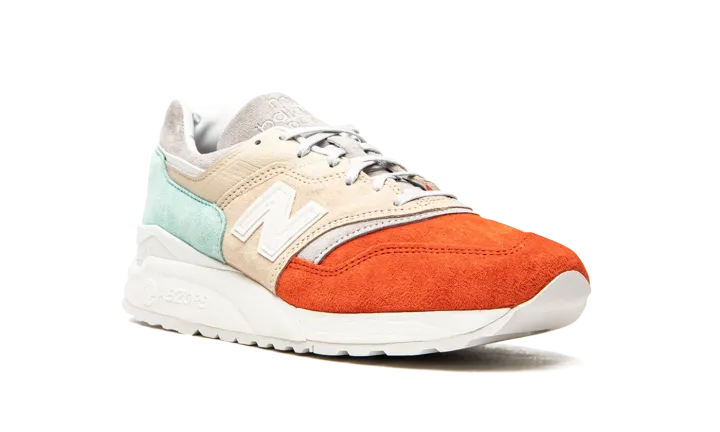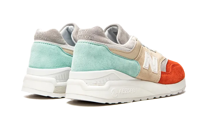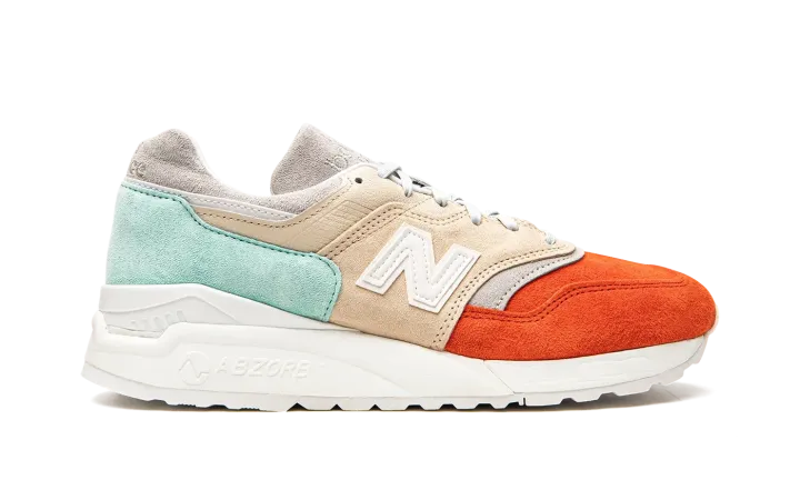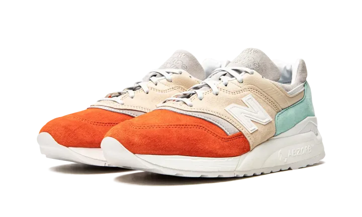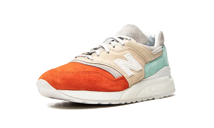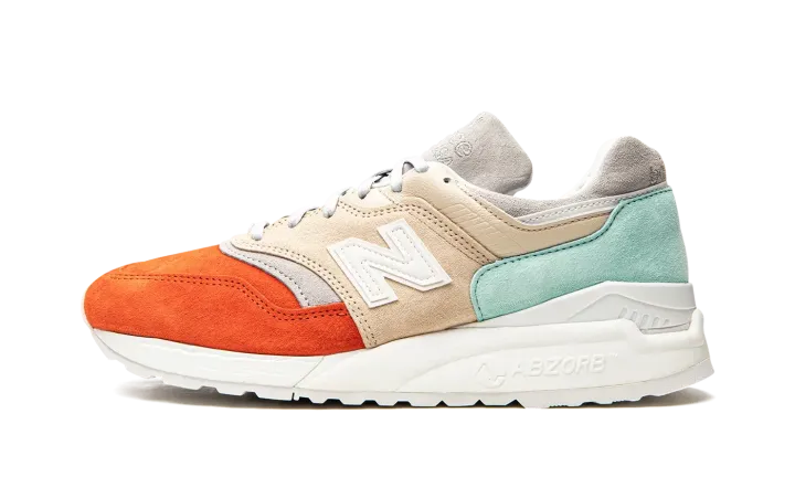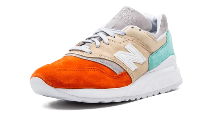 These sneakers from the Mykonos collection are a collaboration between New Balance and designer Ronnie Fieg. They utilize the Made in USA 997.5 silhouette with inspiration from the Nammos resort in Mykonos, Greece. The Cyclades tri-color design is inspired by the seafoam green water, orange beach umbrellas and beige sand at the beach-side haven. The upper is pigskin suede paired with a white 998 ABZORB midsole unit.