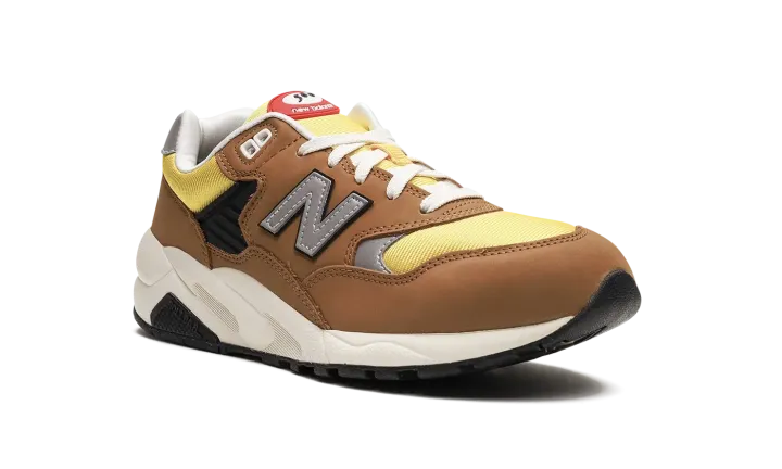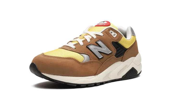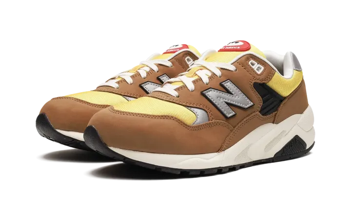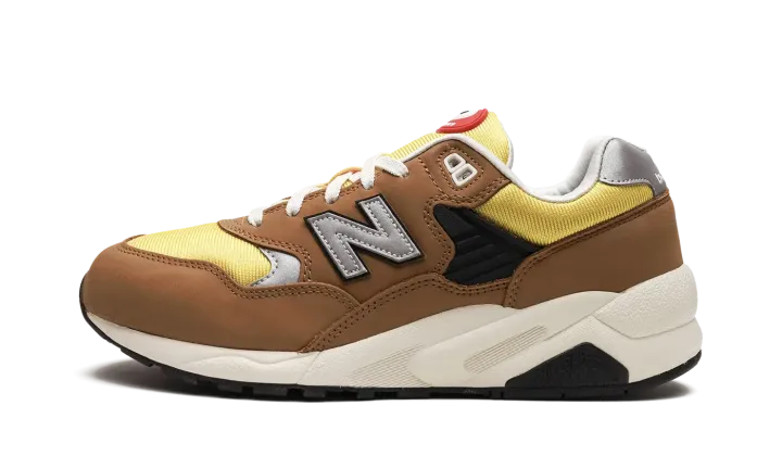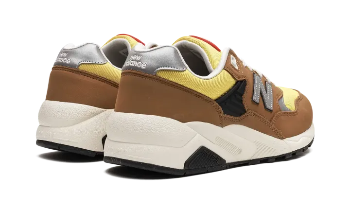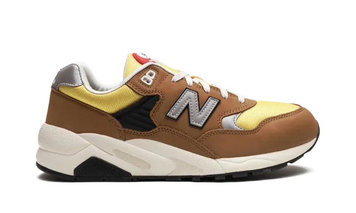 The New Balance 580 "Workwear" is a colorway of the retro running shoe with a rugged appearance inspired by workwear clothing. The design features a yellow mesh base contrasted with brown suede overlays throughout the upper. A grey "N" logo appears on either side of the shoe. White "New Balance" branding is embroidered on the silver leather heel tab. "NB 580" detailing is found on the tongue. The shoe's chunky, black rubber midsole completes the look.