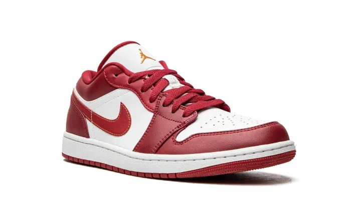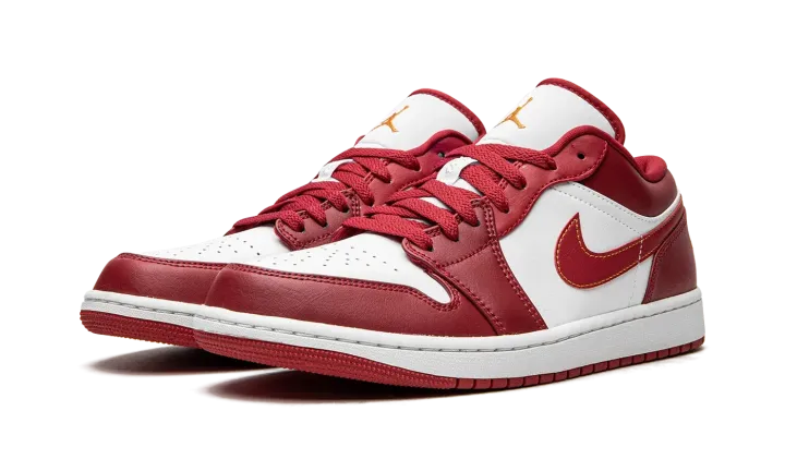 The Air Jordan 1 Low "Cardinal Red" is a simple and clean take on the classic Jordan sneaker. It features an all-leather upper with a white base and Cardinal Red overlays. Small hits of Light Curry can be seen on the Jumpman branding on the tongue, Wings logo on the back heel, and contrasting stitching on the Swoosh on the sides.
