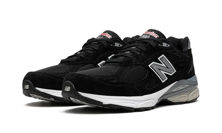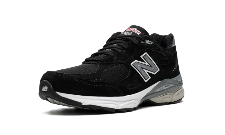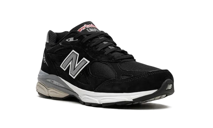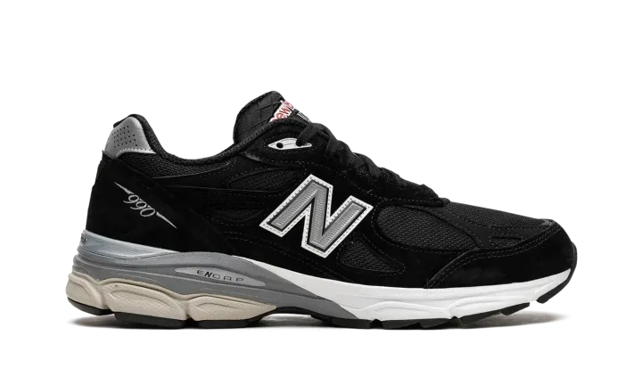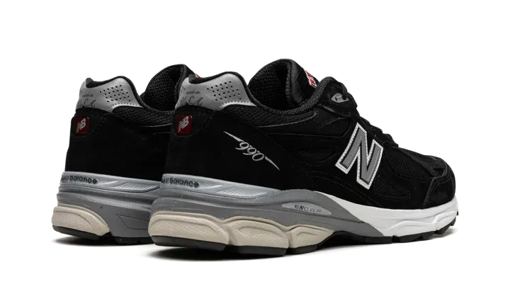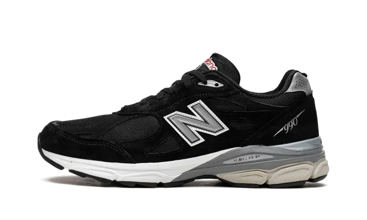 The New Balance 990 v3 "Black/White" is a versatile, mostly monochromatic black colorway of the popular lifestyle sneaker. Thanks to its collaborations with Teddy Santis and its many appealing colorways, like the "Black/White" style, the New Balance 990 v3 is one of the most popular models from the Boston based footwear brand's line of Made in the USA sneakers. The upper is complete with a black mesh base with tonal suede overlays. A silver "N" logo appears on the side. Silver perforated leather is found on the heel tab. Red "New Balance 990" detailing is seen on the tongue. The shoe's ENCAP cushioned midsole provides all-day comfort.