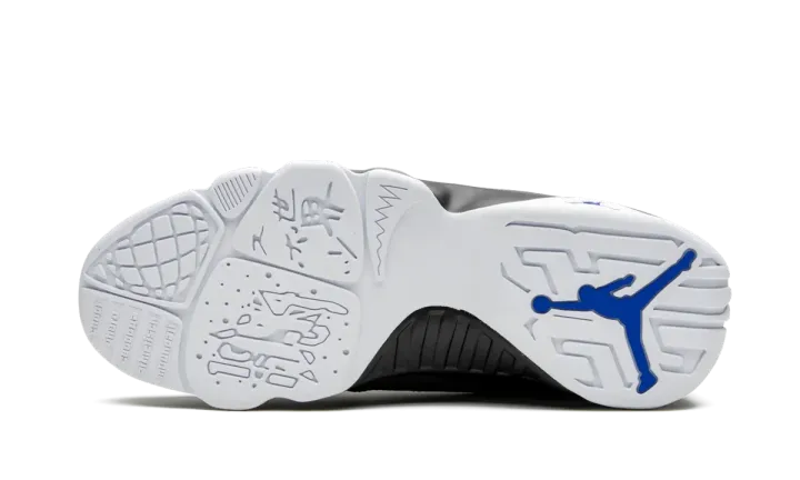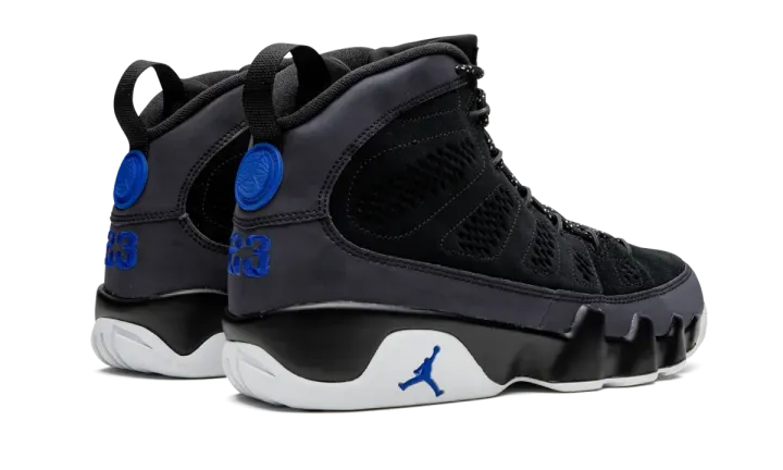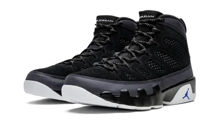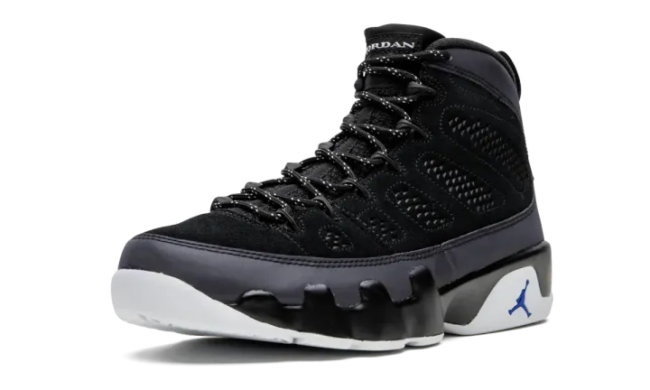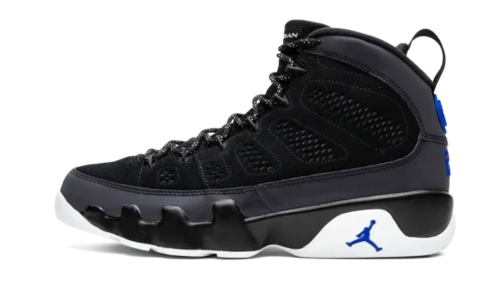The Air Jordan 9 "Racer Blue" is a futuristic take on Michael Jordan's ninth signature model. Despite originally releasing during Jordan's first retirement from basketball, the Jordan 9 holds a special place in the lineage of Air Jordans if not for the simple fact that Jordan only wore the shoe during his brief stint with the Washington Wizards. The "Racer Blue" Jordan 9 features a black nubuck upper that is contrasted by speckled black and white rope laces. An iridescent matte blue finish is applied to the signature mudguard that extends to the heel and up to the collar, which showcases an array of colors when hit with light. The heel globe logo and the Jumpman on the midsole are both presented in royal blue. The look is finished off with a painted black midsole and white rubber outsole. Release date: January 25, 2020.