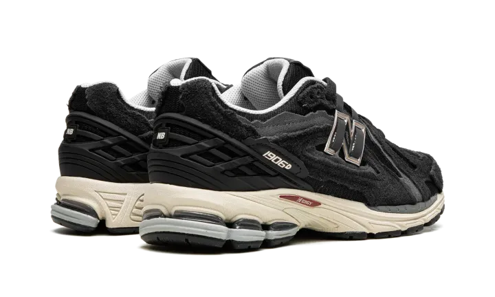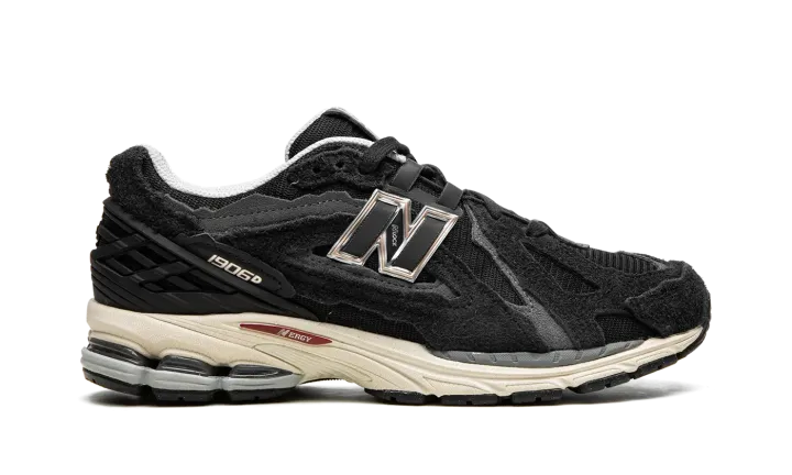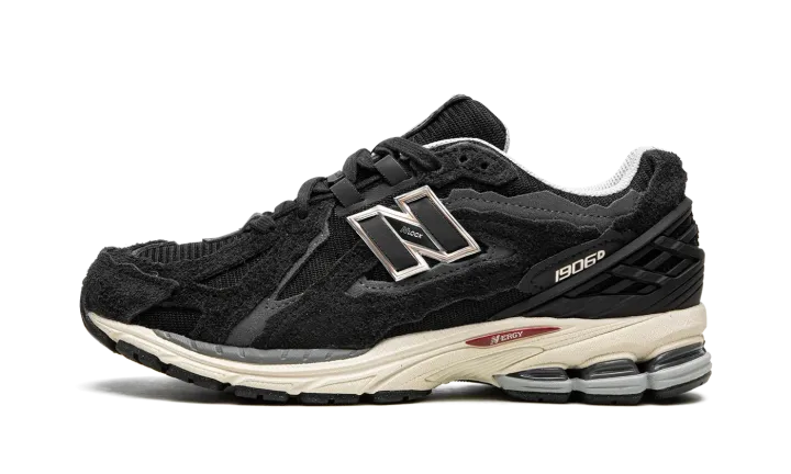 The New Balance 1906R "Protection Pack - Black" is a versatile, black-based colorway of the lifestyle shoe with a retro-looking appearance. New Balance's "Protection Pack" of 1906R colorways gives the model jagged-cut overlays for a can't-miss look. For this "Black" colorway, the shoe features a black mesh base with tonal suede overlays. A black "N" logo with silver trim appears on the sides. "1906" branding is printed on the lateral side of the black plastic heel counter. Underfoot, a cream rubber N-ergy cushioned midsole and black rubber outsole complete the look. Release date: January 6, 2023