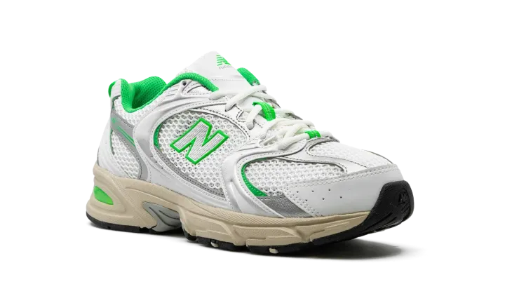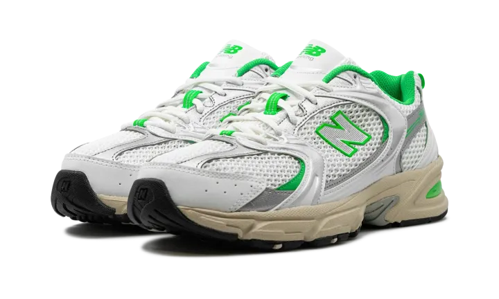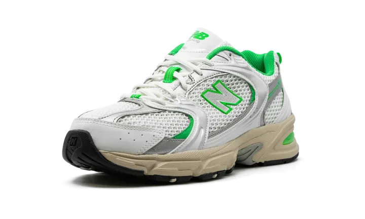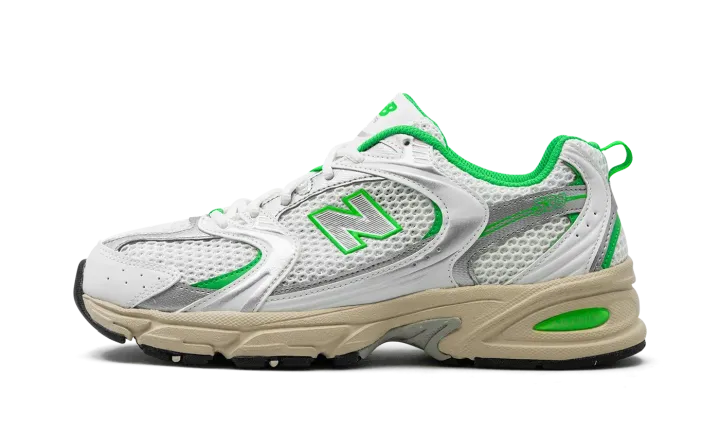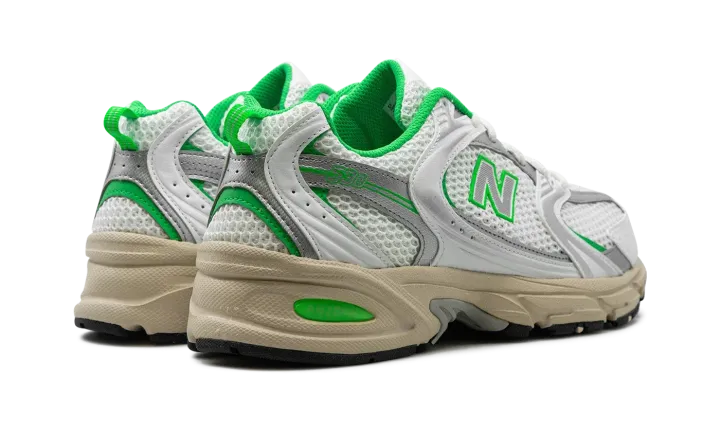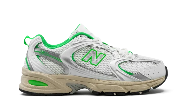 The New Balance 530 "White/Palm Leaf" is a colorway of the retro performance running and lifestyle shoe with aged details. Debuted in 1992, the New Balance 530 was originally a running shoe before transitioning into New Balance's lifestyle category in the present day. The colorway at hand features a white open-mesh upper with metallic leather overlays accented in an eye-catching Palm Leaf hue. A white "N" with Palm Leaf-colored trim appears on the sides, while a "530" logo can be seen on the lateral side of the heel. Classic "NB" detailing is embroidered on the tongue. The shoe's chunky midsole is given an aged look, and is equipped with New Balance's signature ABZORB cushioning for all-day comfort.