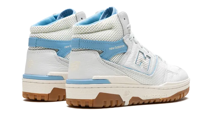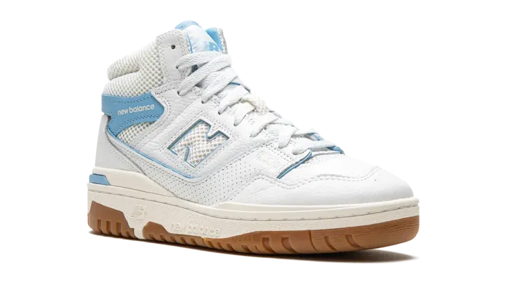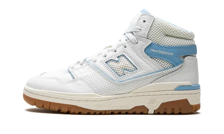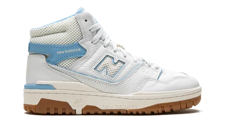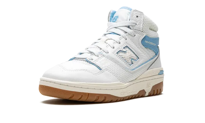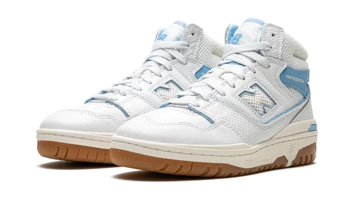 The Aimé Leon Dore x New Balance 650 "Blue Haze" is a collaboration by the New York based clothing company on the high-top retro basketball shoe with a "UNC" inspired look. Inspired by but in no way affiliated with the University of North Carolina, the "Blue Haze" 650 by Aimé Leon Dore features the colors of the college's athletic teams on its design. The shoe has a white leather upper with a Blue Haze leather overlay with "New Balance" branding on the collar. Additional Blue Haze accenting lands on the piping found throughout the shoe and on the outline of the white perforated "N" logo on the side. Classic "New Balance 650" detailing appears on the tongue. The shoe's white rubber midsole and gum rubber outsole complete the look. Release date: June 23, 2023