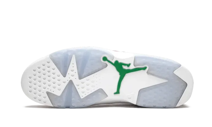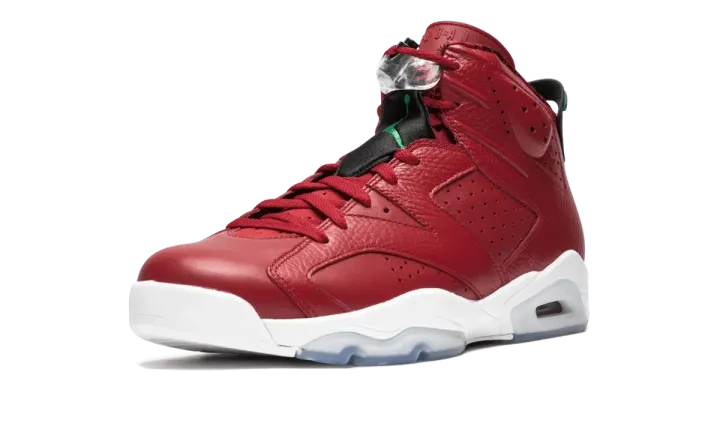 An homage to the original Air Jordan Spiz'ike, the popular hybrid retro model by Spike Lee, this Air Jordan 6 gets a colorway inspired by the original Spiz'ike colorway, but with a fully red upper and green and white accents. The original Spiz'ike graphic print adorns the inner lining.